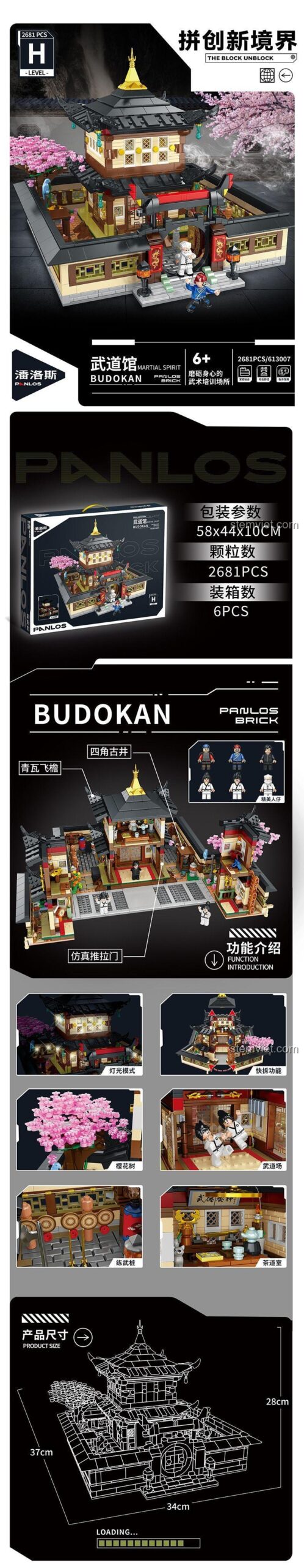 Ngay từ cái nhìn đầu tiên, Võ Đạo Quán Panlos Brick đã chinh phục mọi ánh nhìn bởi thiết kế vô cùng chi tiết và chân thực. Từng đường nét, từ mái ngói cong vút đặc trưng, những khung cửa trượt shoji, cho đến những chiếc đèn lồng đỏ treo cao, tất cả đều toát lên vẻ đẹp cổ kính và uy nghiêm của kiến trúc Nhật Bản. Đặc biệt, mô hình còn được điểm xuyết bởi một cây hoa anh đào đang nở rộ rực rỡ, mang đến một nét mềm mại, thơ mộng cho tổng thể công trình. Với kích thước ấn tượng sau khi hoàn thành là 34cm dài, 37cm rộng và 28cm cao, đây sẽ là một vật trưng bày tuyệt đẹp trong phòng của bé hoặc không gian chung của gia đình. Cấu trúc mô hình thông minh cho phép mở ra để khám phá toàn bộ không gian nội thất bên trong, từ phòng luyện võ rộng rãi, phòng trà đạo thanh tịnh cho đến các khu vực phụ trợ khác, tất cả đều được tái hiện một cách tỉ mỉ.