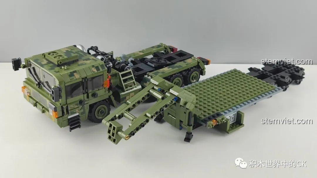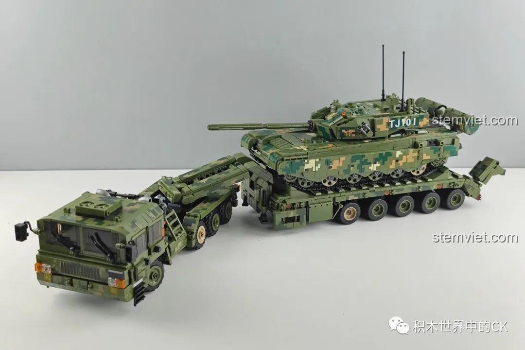 Không kém phần ấn tượng là chiếc xe đầu kéo hạng nặng. Cabin xe có thiết kế hiện đại, nội thất đầy đủ với vô lăng, ghế ngồi, bảng điều khiển. Đặc biệt, cabin có thể lật về phía trước để lộ ra khối động cơ chi tiết bên trong. Phần rơ-moóc phía sau được thiết kế vững chãi với hệ thống nhiều bánh xe, đảm bảo có thể chịu được sức nặng của ‘quái vật thép’ 99A. Cầu dẫn có thể hạ xuống, mô phỏng hoàn hảo quá trình vận chuyển xe tăng ra chiến trường.