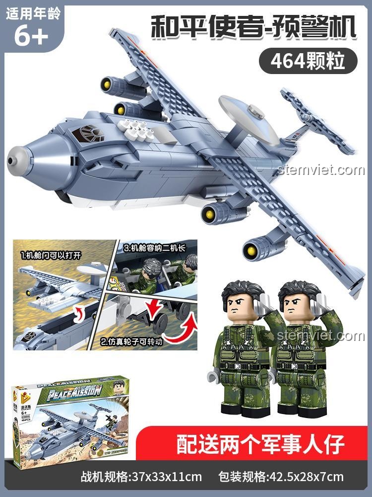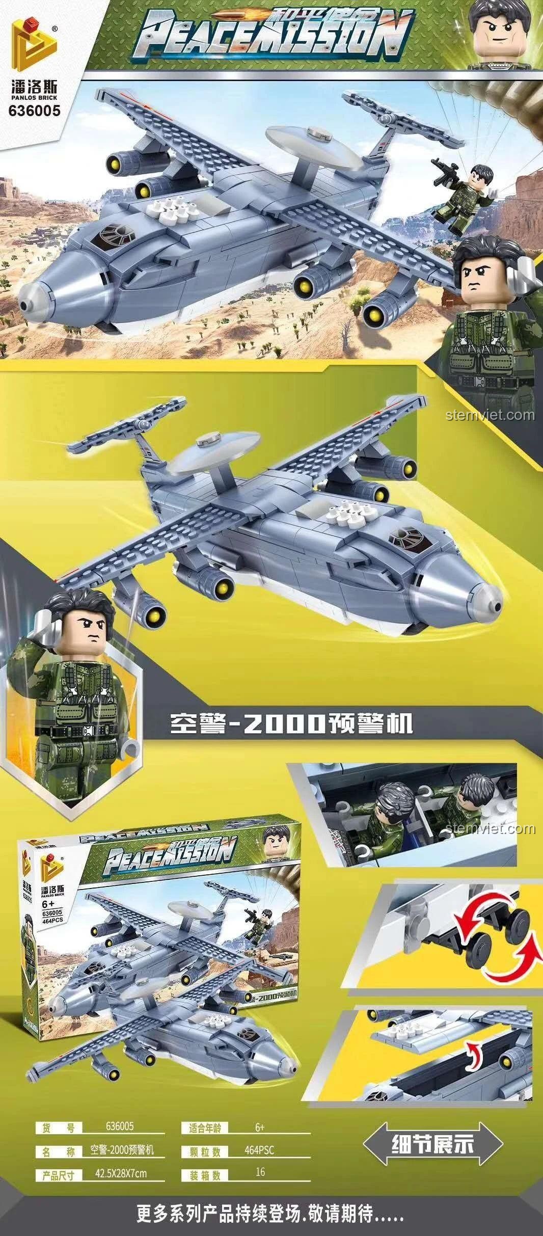 Máy bay cảnh báo sớm PanlosBrick 636005 có cánh máy bay có thể gập lại, cửa khoang hàng mở được, bánh xe xoay linh hoạt và ăng-ten radar xoay độc đáo, cùng với 2 phi công đi kèm.