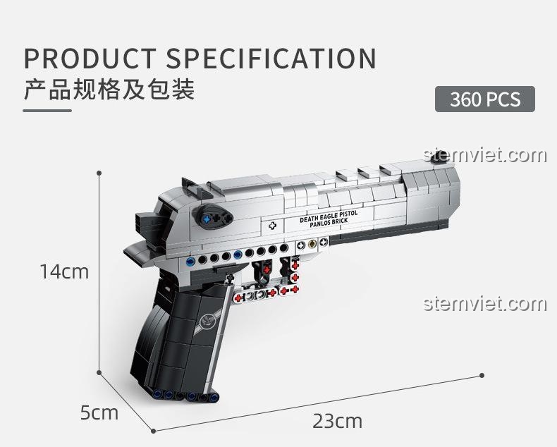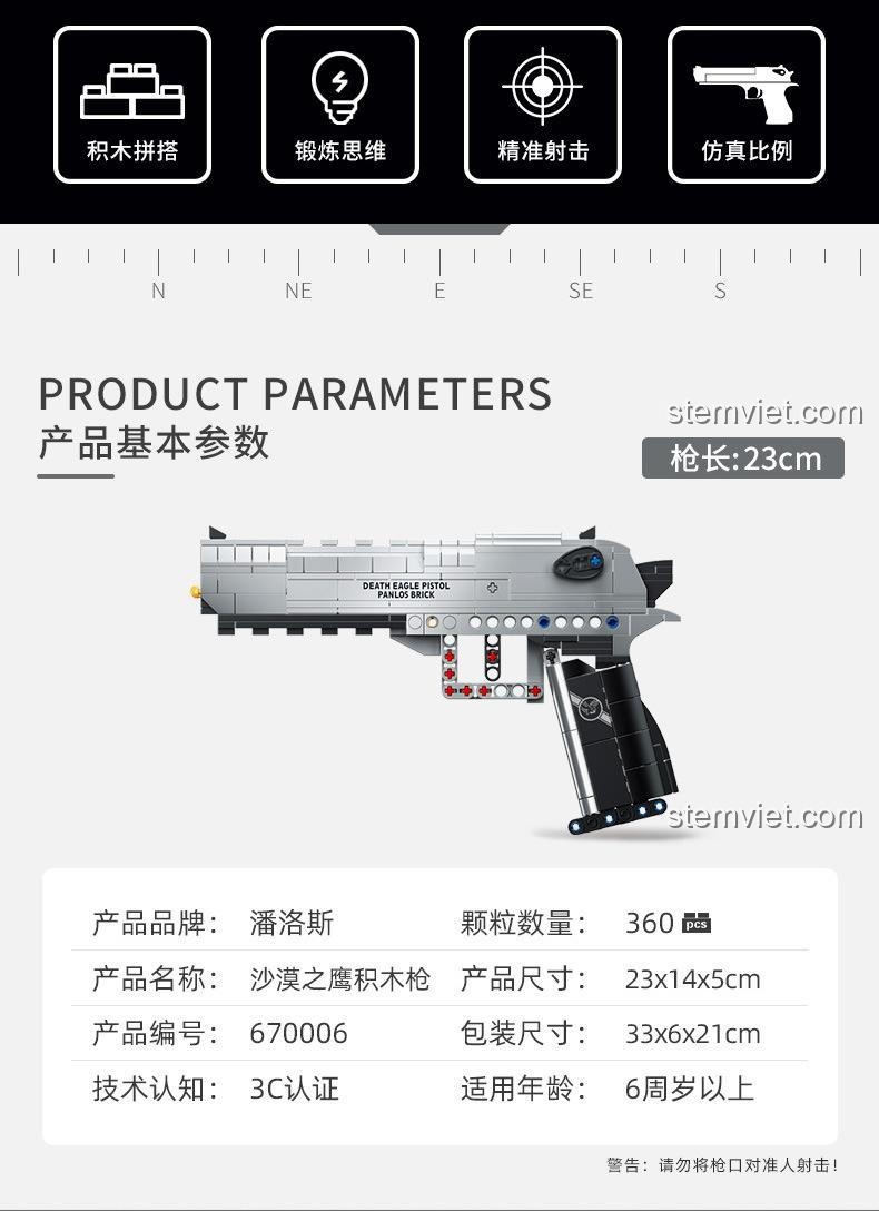 Bộ lắp ráp PanlosBrick 670006 tái hiện sống động hình dáng của khẩu súng lục Desert Eagle huyền thoại, một biểu tượng trong thế giới vũ khí. Với 360 mảnh ghép được chế tác tỉ mỉ, bé sẽ có cơ hội tự tay xây dựng nên một mô hình có độ chi tiết cao, thể hiện rõ từng đường nét, bộ phận của khẩu súng. Tông màu chủ đạo trắng, đen và xám kết hợp hài hòa, tạo nên vẻ ngoài mạnh mẽ và hiện đại, phù hợp với sở thích của các bé trai năng động.