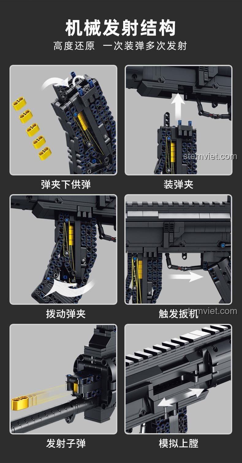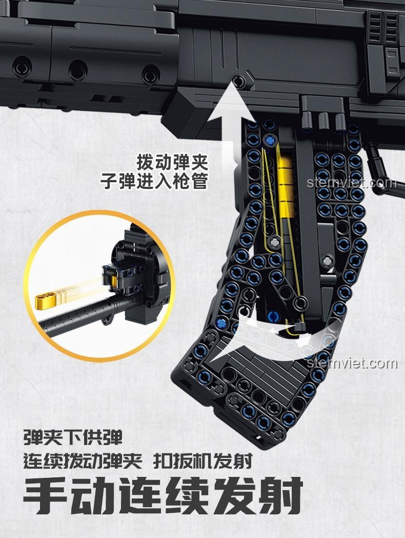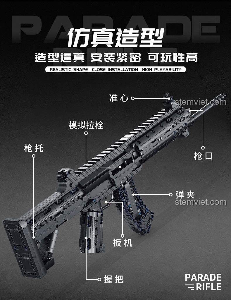 Mô hình Súng Mô Hình Quân Sự này không chỉ dừng lại ở việc lắp ráp mà còn mang đến tính tương tác cao. Bé có thể mô phỏng các thao tác lên đạn, gạt hộp đạn một cách chân thực, giúp tăng cường sự khéo léo và phối hợp tay mắt. Đây là một đồ chơi lắp ráp Súng Lắp Ráp Diễu Binh 670008 hoàn hảo cho những bé yêu thích hành động và muốn thử sức với các mô hình có tính năng đặc biệt.