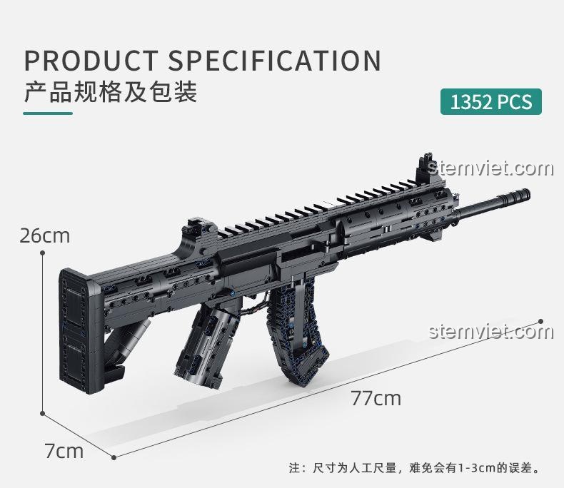 Bộ đồ chơi lắp ráp Súng Lắp Ráp Diễu Binh PanlosBrick 670008 gây ấn tượng mạnh mẽ ngay từ cái nhìn đầu tiên với thiết kế tỉ mỉ và độ chân thực cao. Với chiều dài mô hình lên đến 77cm, chiều cao 26cm và chiều rộng 7cm, khẩu súng mô hình này có tỉ lệ 1:1 so với súng thật, mang lại cảm giác như đang cầm một khẩu súng trường diễu binh thực thụ. Màu sắc chủ đạo là đen và xám, tạo nên vẻ ngoài mạnh mẽ, uy nghiêm, đúng chất quân đội.