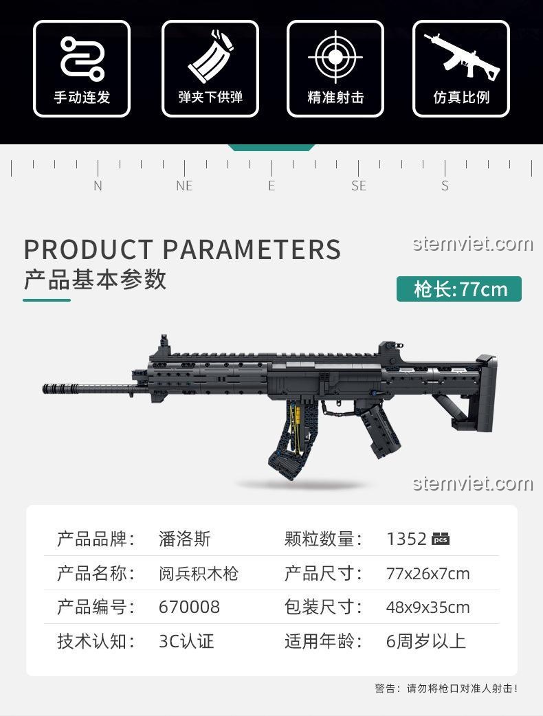 Bộ lắp ráp PanlosBrick 670008 Súng Lắp Ráp Diễu Binh không chỉ mang lại niềm vui mà còn là công cụ giáo dục hiệu quả, giúp bé trai 6 tuổi trau dồi nhiều kỹ năng quan trọng. Khi lắp ráp 1352 mảnh ghép, bé sẽ rèn luyện khả năng suy luận logic, lập kế hoạch và giải quyết vấn đề. Sự kiên nhẫn và tập trung chi tiết cũng được nâng cao đáng kể trong quá trình hoàn thiện mô hình Súng Trường Lắp Ghép này.