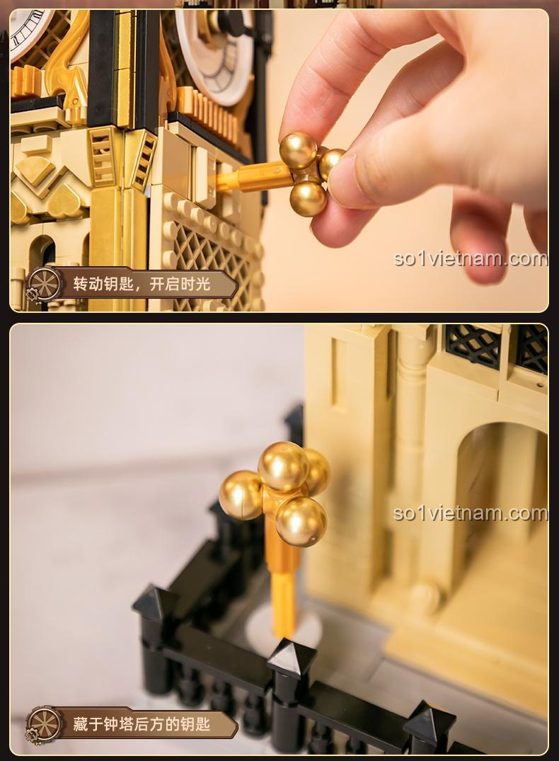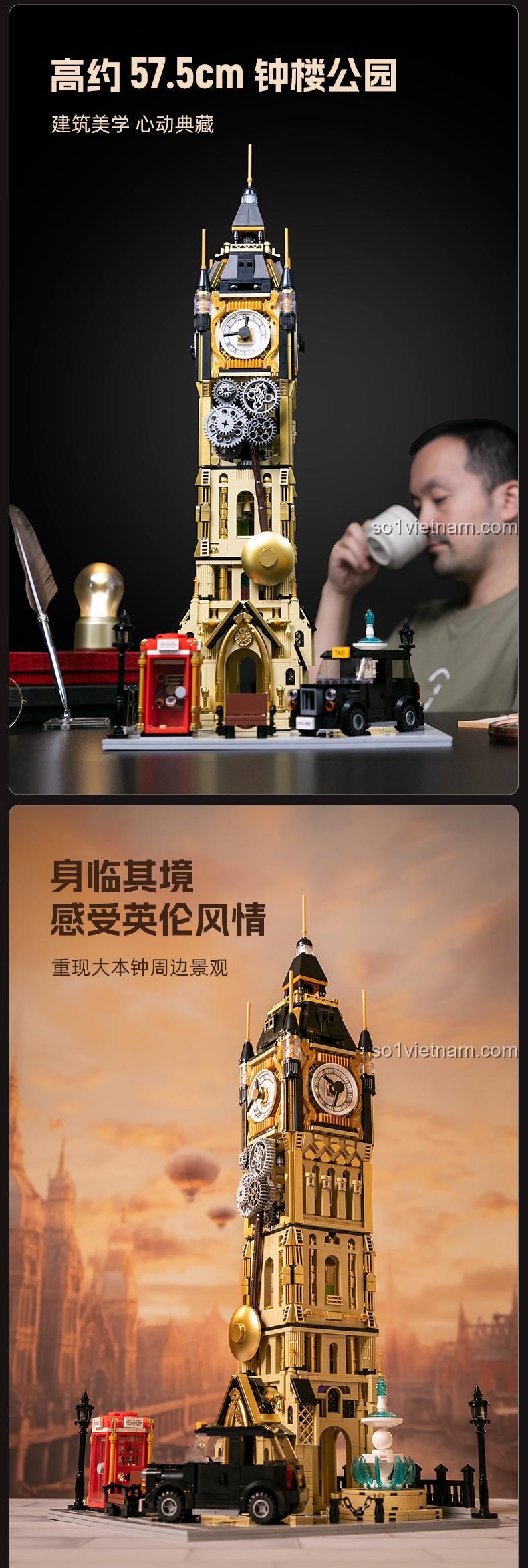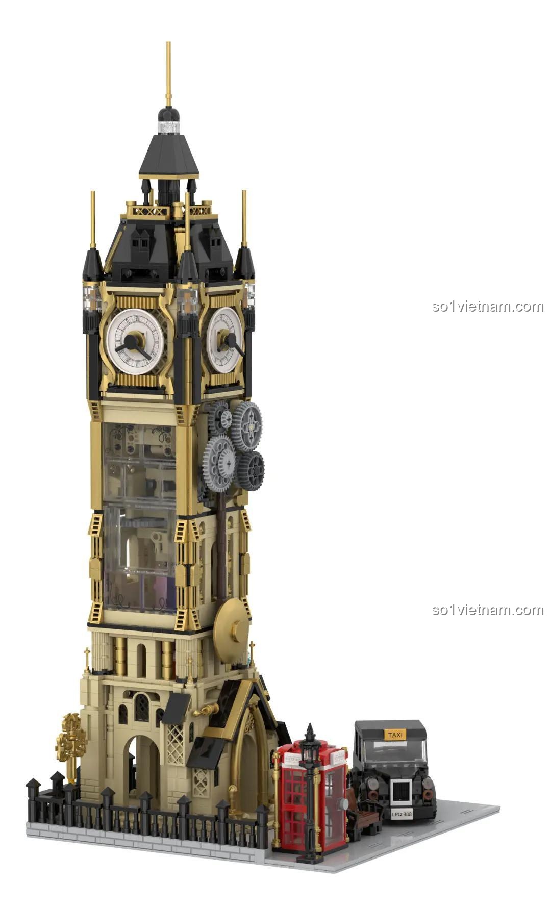 Điểm nhấn đặc biệt của bộ lắp ghép này chính là cơ chế truyền động phức tạp bên trong tháp. Với các bánh răng được thiết kế tinh vi và bộ phận hồi chuyển, mô hình không chỉ đẹp về hình thức mà còn mang đến sự sống động và chân thực. Bạn có thể điều chỉnh thời gian trên cả bốn mặt đồng hồ, mang lại cảm giác như đang vận hành một cỗ máy thời gian thực thụ. Sự kết hợp giữa kiến trúc cổ điển và cơ khí Steampunk tạo nên một sản phẩm độc đáo, thu hút mọi ánh nhìn và là niềm tự hào cho bất kỳ ai sở hữu nó.