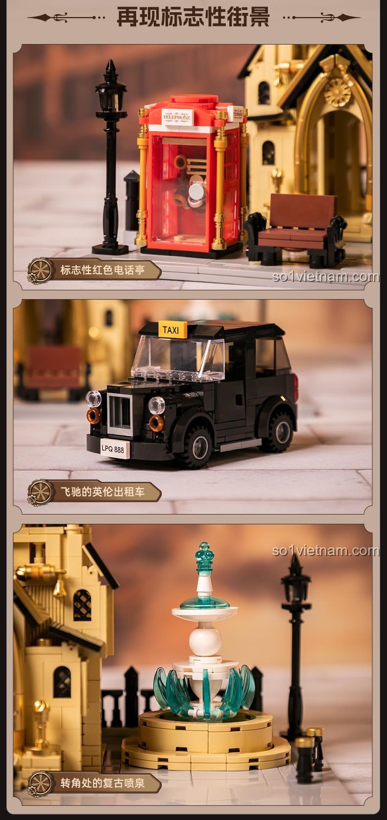 Bộ lắp ghép Pantasy 85008 không chỉ là một mô hình tĩnh. Với cơ chế truyền động phức tạp, bạn có thể tương tác với mô hình, điều chỉnh thời gian trên các mặt đồng hồ và chiêm ngưỡng sự vận hành nhịp nhàng của các bánh răng. Sự kết hợp giữa các yếu tố kiến trúc cổ điển và công nghệ hơi nước đặc trưng của phong cách Steampunk tạo nên một thế giới tưởng tượng đầy hấp dẫn. Mô hình còn đi kèm với các phụ kiện sinh động như xe taxi màu đen, bốt điện thoại đỏ đặc trưng, vòi phun nước và đèn đường, giúp tái hiện một góc phố London đầy sống động và chân thực.