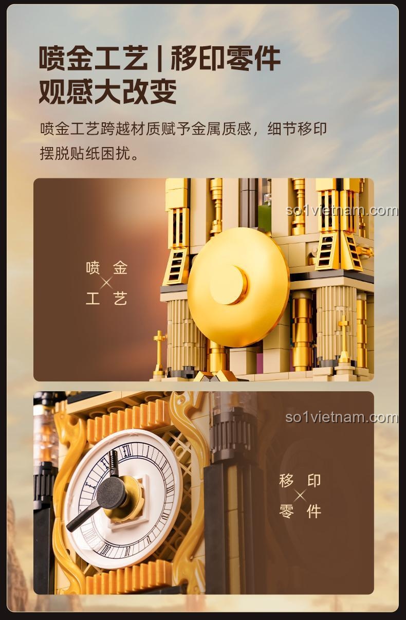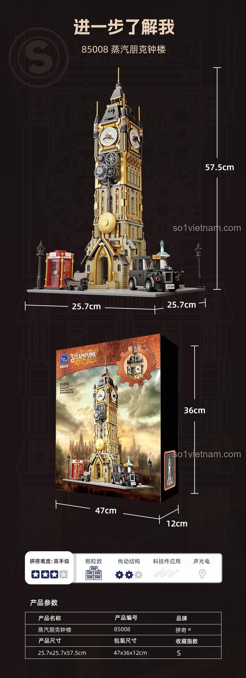 Với chiều cao ấn tượng lên đến 57.5cm và 2460 mảnh ghép chi tiết, Pantasy 85008 là một tuyệt tác về thiết kế. Từng chi tiết nhỏ nhất của Tháp Đồng Hồ Victoria đều được tái hiện một cách tỉ mỉ, từ những ô cửa sổ vòm tinh xảo, các chi tiết trang trí mang đậm phong cách Gothic, cho đến những bánh răng cơ khí khổng lồ lộ ra ngoài, tạo nên nét đặc trưng không thể nhầm lẫn của phong cách Steampunk. Màu vàng kim loại chủ đạo kết hợp với màu đen và trắng tạo nên vẻ ngoài sang trọng, quyền quý và đầy cuốn hút. Các mảnh ghép được in ấn sắc nét, đảm bảo độ chính xác và thẩm mỹ cao, mang đến trải nghiệm lắp ráp thú vị và kết quả cuối cùng là một mô hình trưng bày đẳng cấp.