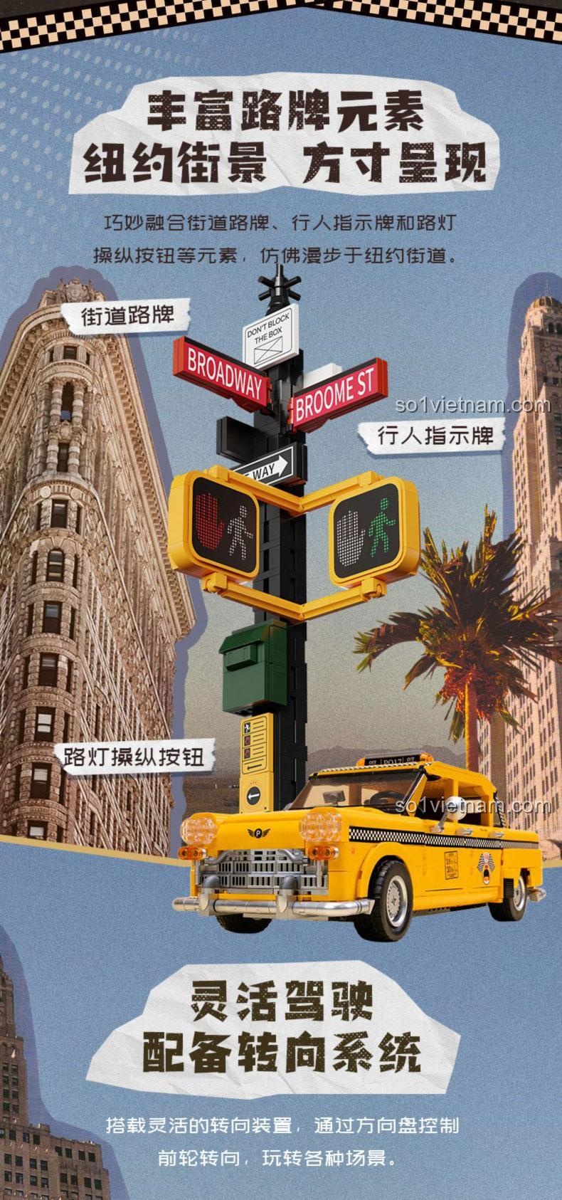 Ngay từ cái nhìn đầu tiên, bạn sẽ bị chinh phục bởi vẻ đẹp cổ điển không thể nhầm lẫn của đồ chơi mô hình Pantasy 85017. Từng đường cong của thân xe, lưới tản nhiệt mạ crom sáng bóng, và đặc biệt là màu vàng đặc trưng đã được tái hiện một cách trung thực và đầy cảm xúc. Với kích thước ấn tượng 36.5 x 16 x 12.5 cm sau khi hoàn thành, mô hình này thực sự là một tác phẩm nghệ thuật để trưng bày. Điểm nhấn không chỉ dừng lại ở chiếc xe. Bộ sản phẩm còn đi kèm một cột đèn giao thông và biển báo đường phố mang tên “Broadway” và “Broome St”, những địa danh quen thuộc, giúp bạn tạo ra một sa bàn nhỏ đậm chất New York ngay trong không gian của mình. Dải sọc caro đen trắng chạy dọc thân xe, logo taxi trên cửa, và biển số “NY PQ17” đều là những chi tiết nhỏ nhưng đắt giá, thể hiện sự chăm chút tỉ mỉ của nhà sản xuất Pantasy, mang lại một tổng thể hài hòa và sống động như thật.