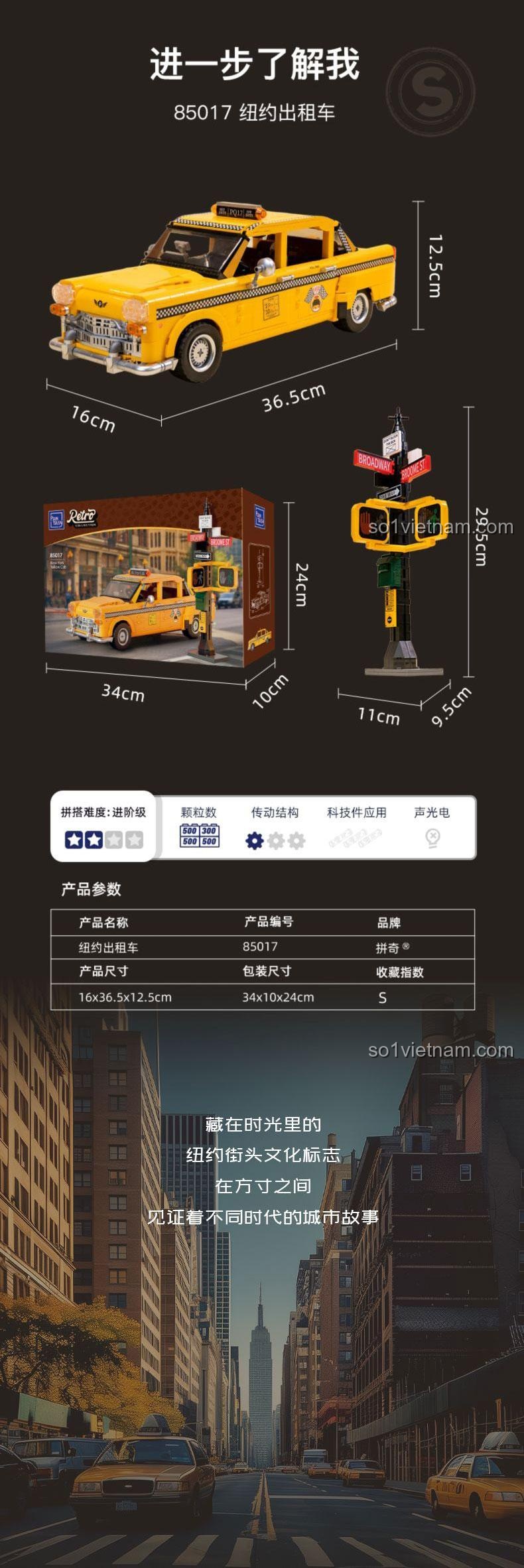 Sau khi lắp ráp xong, chiếc taxi sẽ có kích thước là 36.5cm (dài) x 16cm (rộng) x 12.5cm (cao). Đây là một kích thước lý tưởng để trưng bày trên bàn làm việc, kệ sách hoặc trong tủ kính, tạo nên một điểm nhấn ấn tượng cho không gian của bạn.