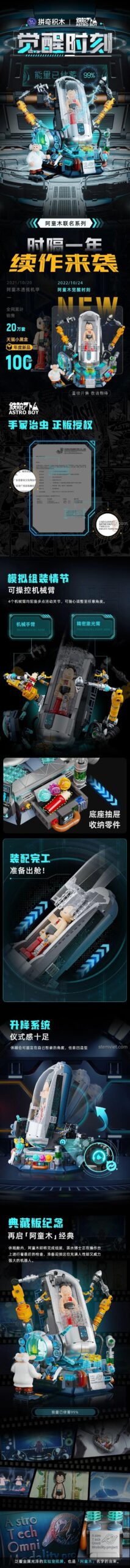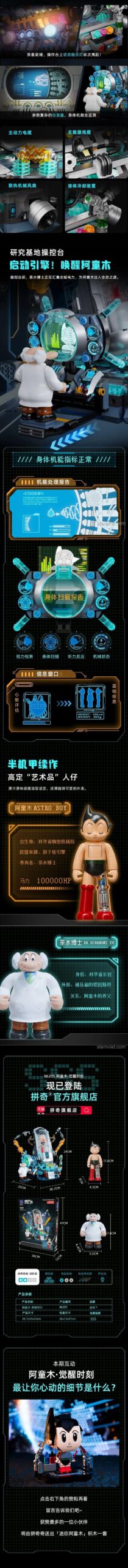 Bộ đồ chơi lắp ráp Robot Astro Boy này là một kiệt tác về thiết kế và độ chính xác. Với kích thước ấn tượng 30.7 cm (Dài) x 24 cm (Rộng) x 25 cm (Cao), mô hình Astro Boy Pantasy này sẽ là điểm nhấn nổi bật trong bất kỳ bộ sưu tập nào. Màu sắc chủ đạo là xám bạc của buồng tái tạo, kết hợp với các chi tiết xanh dương, đen và vàng của cánh tay robot và bàn điều khiển, tạo nên một tổng thể hài hòa và hiện đại. Từng mảnh ghép của mô hình Astro Boy 86205 đều được chế tác tỉ mỉ, tái hiện chân thực các đường nét cơ khí phức tạp và biểu cảm của Astro Boy khi nằm trong buồng. Bạn sẽ kinh ngạc trước độ chi tiết của các bộ phận bên trong buồng, từ hệ thống dây dẫn đến các bảng mạch, tất cả đều góp phần tạo nên một cảnh tượng ‘Khoảnh Khắc Thức Tỉnh’ sống động như bước ra từ màn ảnh. Bộ lắp ghép Astro Boy Thức Tỉnh này thực sự là một tác phẩm nghệ thuật kỹ thuật số được biến hóa thành hiện thực.
