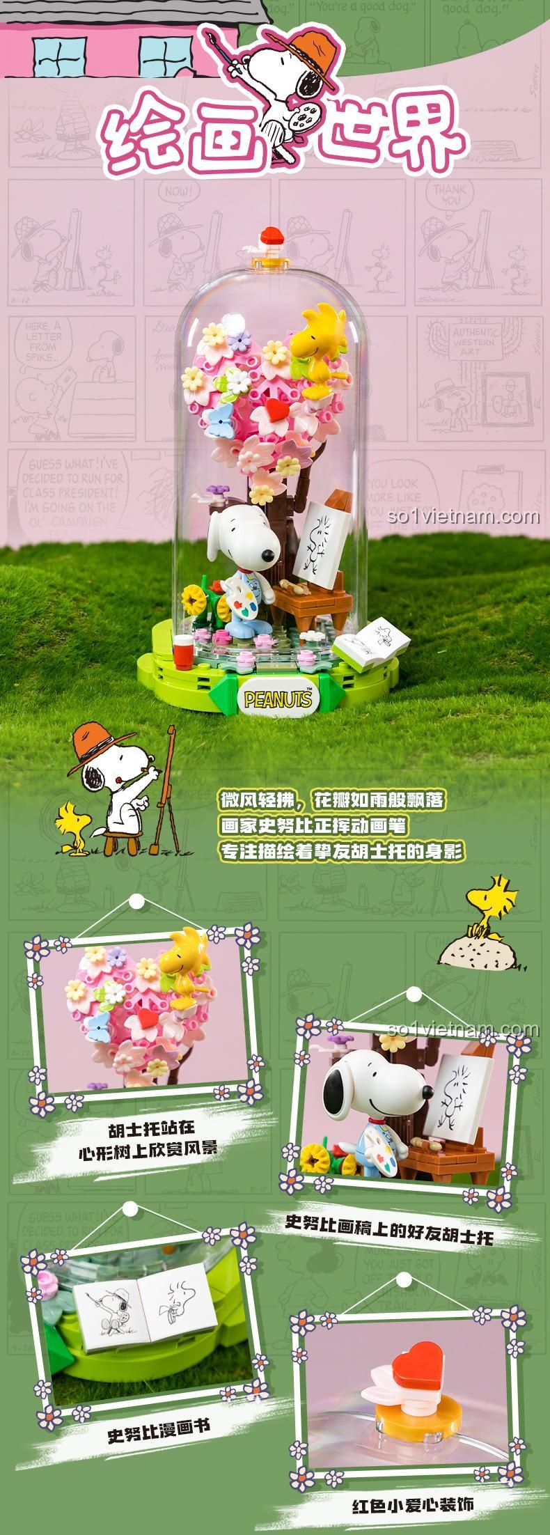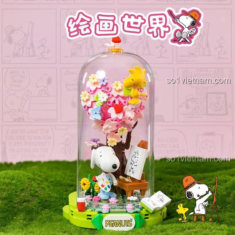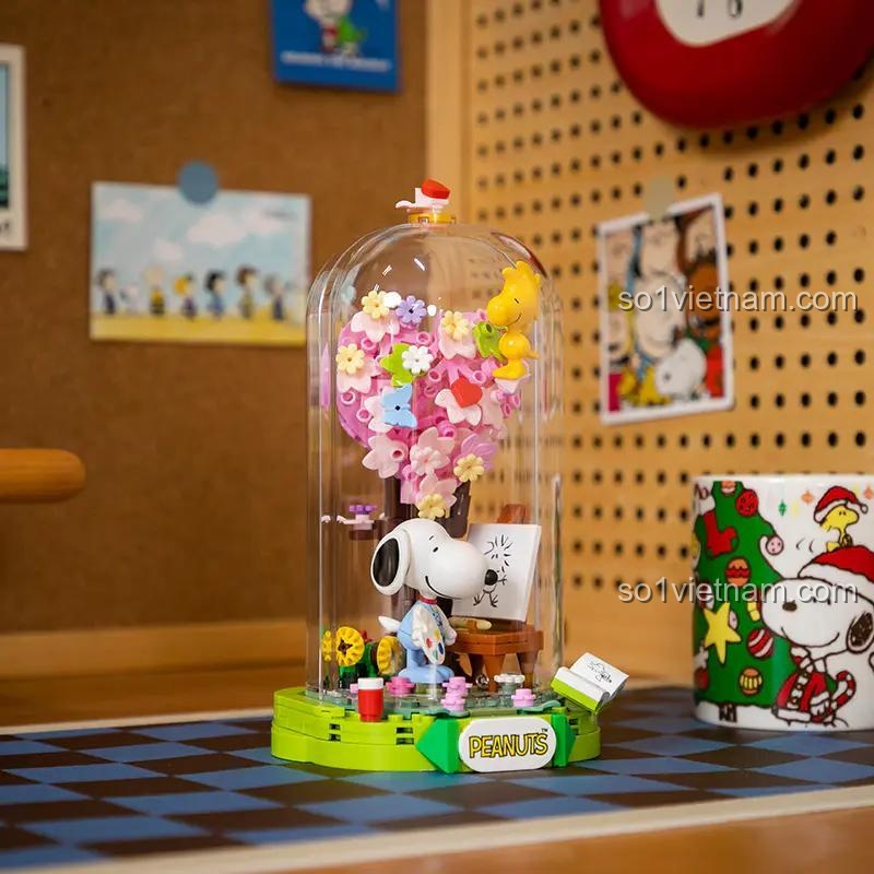 - Thiết kế độc đáo: Mô hình Snoopy vẽ tranh với trái tim hoa và mái vòm kính tạo nên vẻ đẹp ấn tượng.