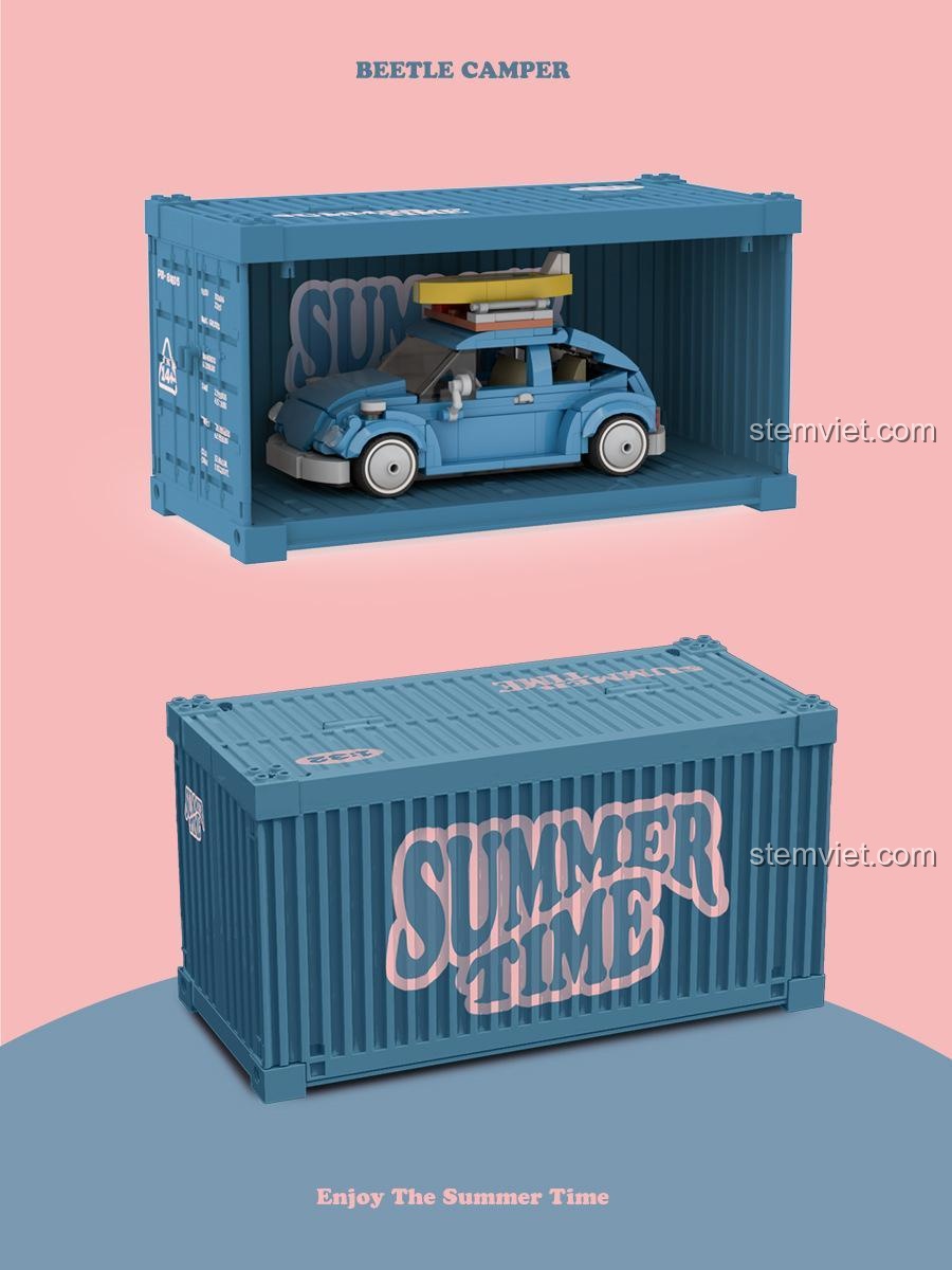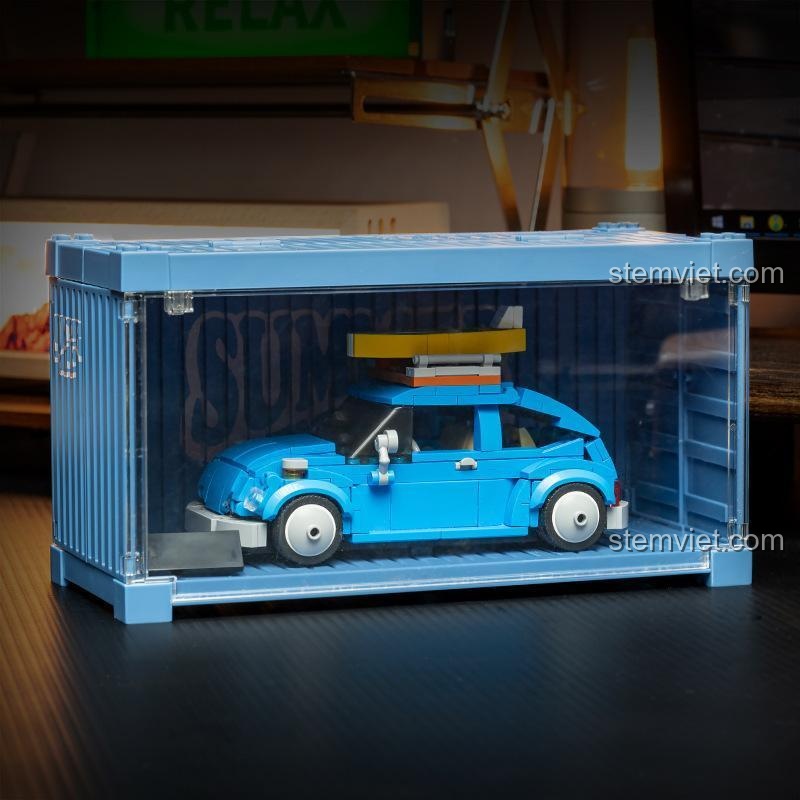 Điểm nhấn đặc biệt của bộ này là hộp trưng bày hình container đi kèm. Sau khi hoàn thành, bé có thể tự hào đặt chiếc xe của mình vào hộp trưng bày, biến nó thành một vật trang trí độc đáo trong phòng. Hộp container không chỉ là nơi cất giữ mà còn là một phần của trải nghiệm, tạo cảm giác như chiếc xe đang được vận chuyển đến một bãi biển đầy nắng để bắt đầu chuyến phiêu lưu mùa hè. Đây là một tính năng đặc biệt mà không phải bộ đồ chơi nào cũng có, làm tăng thêm giá trị sưu tầm và trưng bày cho bộ lắp ráp Xe Dã Ngoại Beetle này.