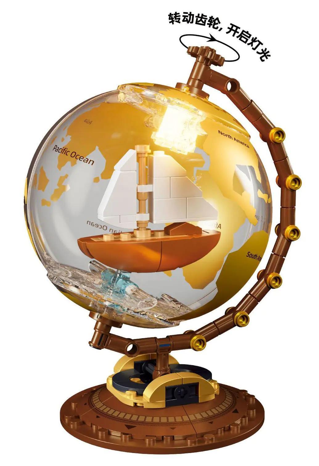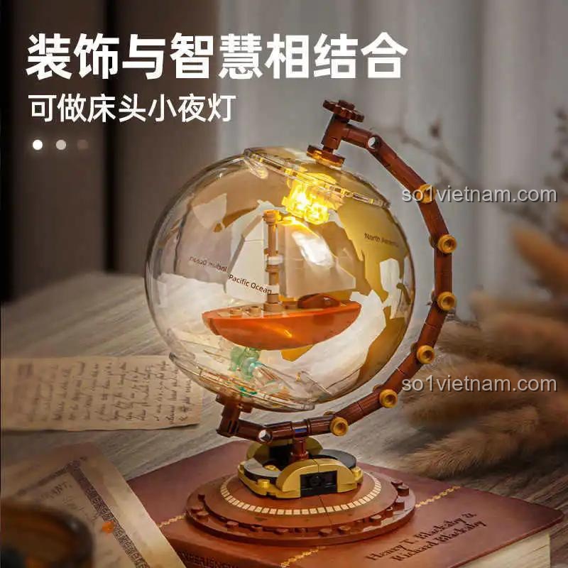 Pleyerid M38-P8068 sở hữu một thiết kế vô cùng ấn tượng và tinh tế. Quả địa cầu được chế tác tỉ mỉ với tông màu vàng chủ đạo, tượng trưng cho sự giàu có, tri thức và ánh sáng. Các lục địa và đại dương được thể hiện rõ nét, mang đến cái nhìn trực quan về bản đồ thế giới. Điểm nhấn đặc biệt là chiếc thuyền buồm nhỏ xinh được đặt bên trong, gợi lên hình ảnh những chuyến phiêu lưu trên biển cả. Khi bật đèn LED, quả địa cầu tỏa sáng lung linh, tạo nên một không gian ấm áp và huyền ảo, biến nó thành một vật trang trí độc đáo cho phòng ngủ hoặc bàn học của bé. Kích thước mô hình sau khi lắp ráp (13.07 x 17 cm) vừa vặn, không chiếm nhiều diện tích nhưng đủ để tạo điểm nhấn thu hút.
