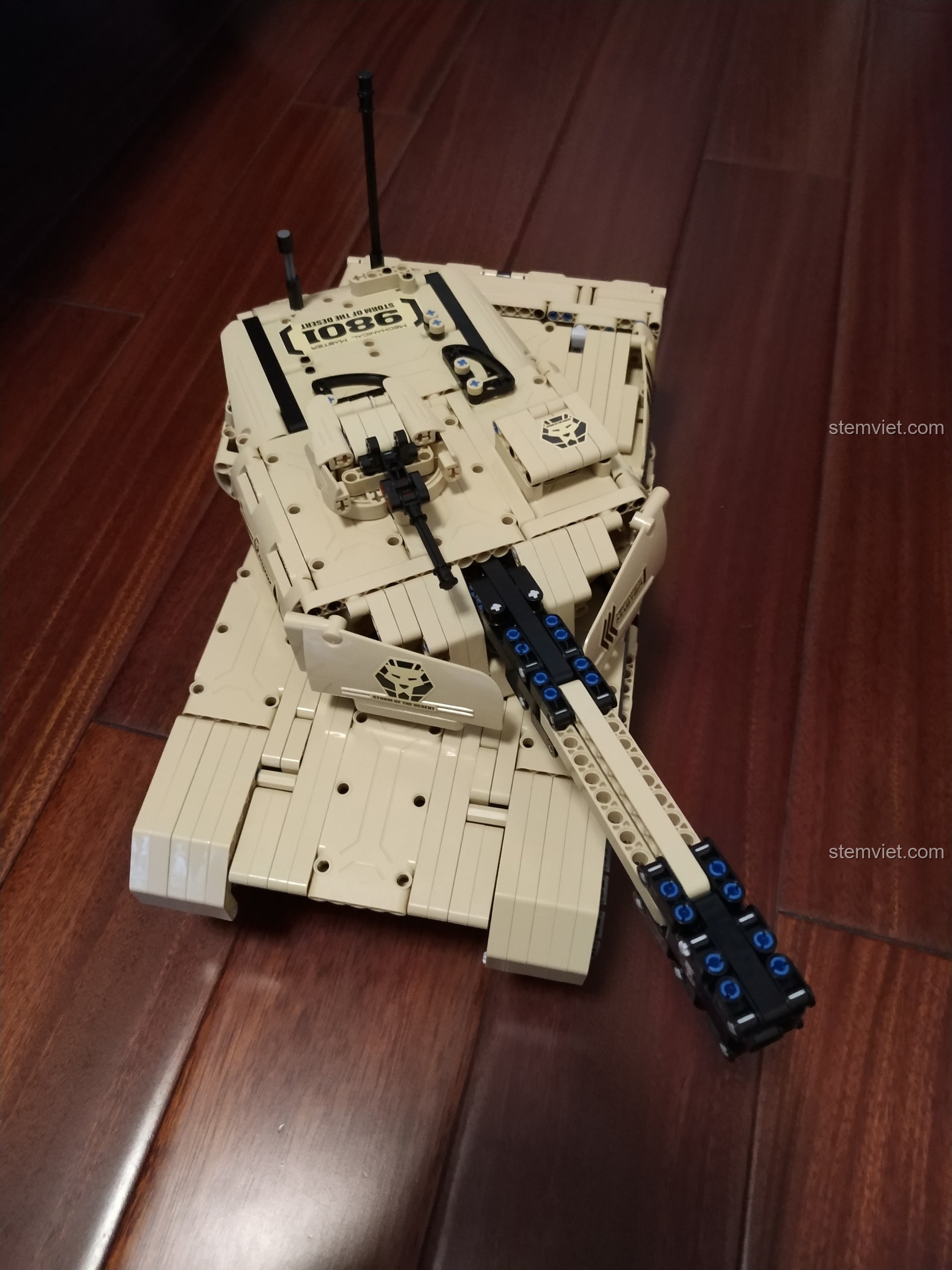 Ngay từ cái nhìn đầu tiên, Mô hình xe tăng sa mạc Qihui 9801 đã gây ấn tượng mạnh mẽ với tông màu vàng cát (tan) đặc trưng, gợi liên tưởng đến những cuộc hành quân trên sa mạc mênh mông. Từng chi tiết trên xe, từ hệ thống bánh xích chắc chắn, các tấm giáp góc cạnh cho đến tháp pháo hầm hố, đều được tái hiện một cách tỉ mỉ thông qua 1276 mảnh ghép theo phong cách Technic. Các chi tiết như ăng-ten, súng máy phụ, cửa sập, và các thanh pin năng lượng màu xanh dương nổi bật tạo nên một tổng thể hài hòa, vừa chân thực vừa mang nét tương lai. Đặc biệt, hệ thống treo độc lập cho từng bánh xe không chỉ là một chi tiết trang trí, nó thực sự hoạt động, giúp xe vượt qua các chướng ngại vật nhỏ một cách mượt mà. Đây chính là vẻ đẹp của kỹ thuật cơ khí, một vẻ đẹp mà chắc chắn cả bố và bé trai 8 tuổi nhà mình đều sẽ say mê khám phá.