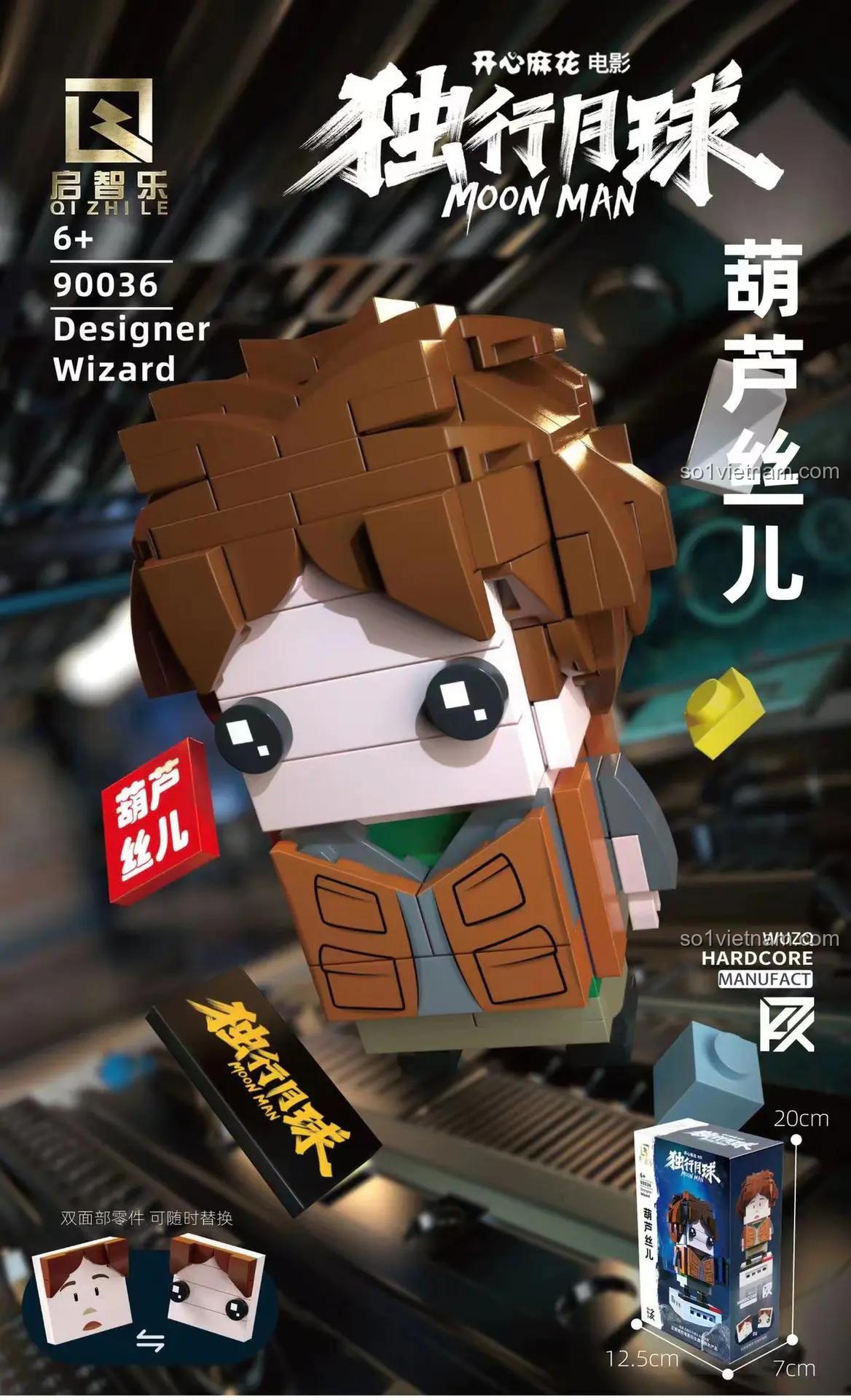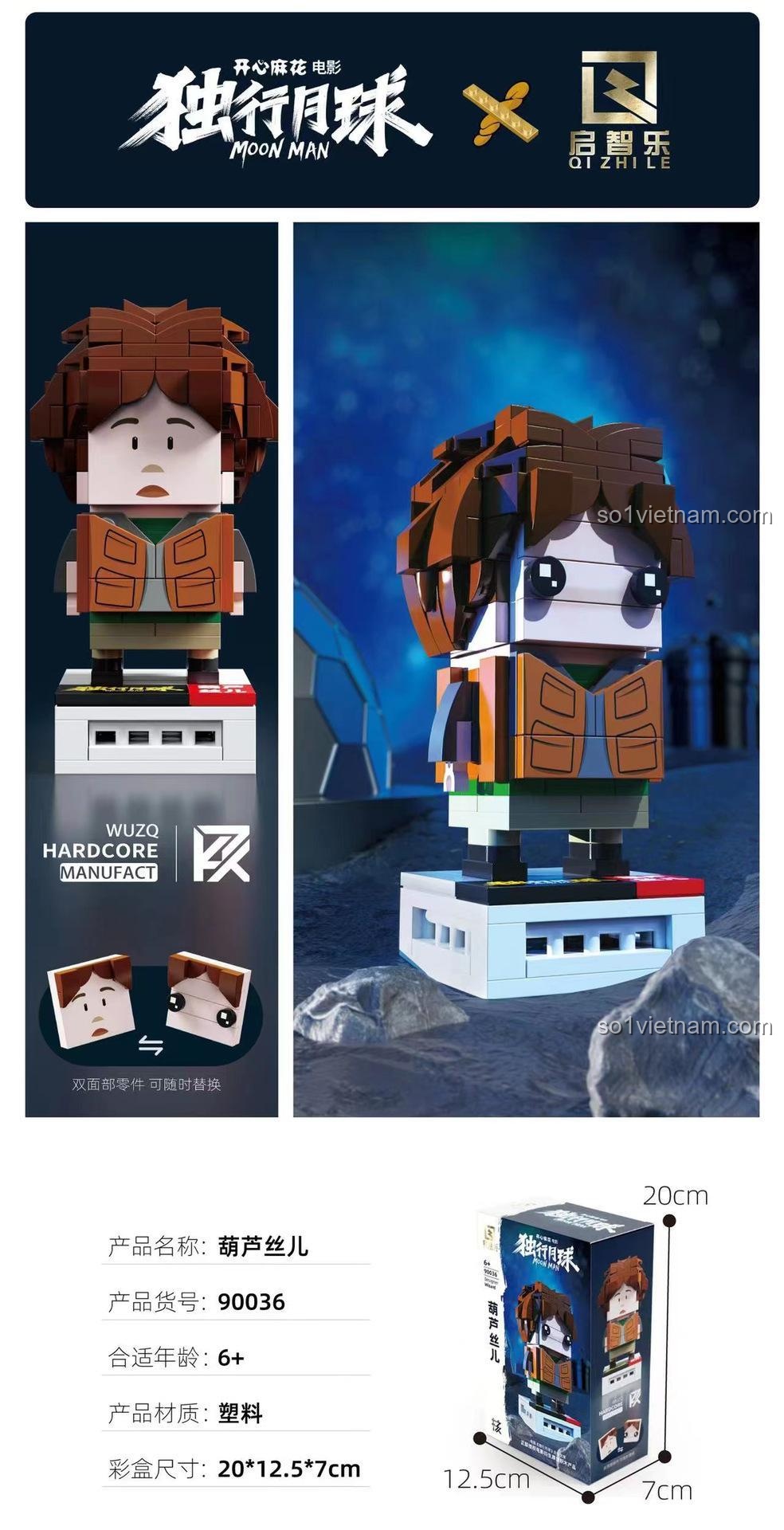 Bộ xếp hình 90036 Hồ Lô Ti của Qizhile gây ấn tượng mạnh với thiết kế chi tiết và khả năng tái hiện chân thực nhân vật từ phim ‘Độc Hành Nguyệt Cầu’. Với màu sắc chủ đạo là nâu, trắng, cam và đen, mô hình toát lên vẻ ngoài đặc trưng của Hồ Lô Ti, từ mái tóc bù xù cho đến bộ trang phục phi hành gia đơn giản nhưng đầy cá tính. Dù không có thông số kích thước mô hình cụ thể, nhưng qua hình ảnh, chúng ta có thể thấy đây là một mô hình figure có kích thước vừa phải, lý tưởng để trưng bày hoặc chơi đùa.