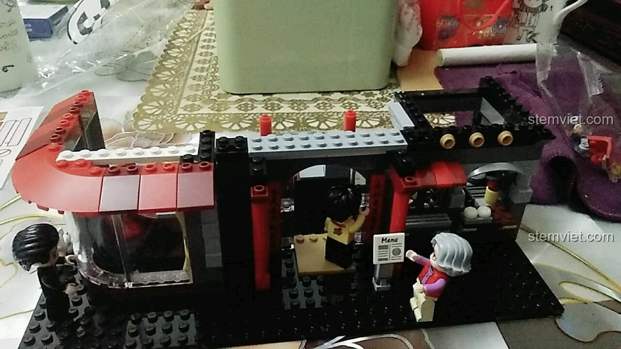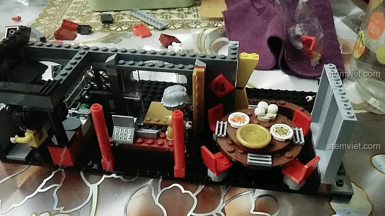 Bộ sản phẩm bao gồm 796 mảnh ghép, 6 nhân vật minifigure đa dạng (chủ quán, đầu bếp, khách hàng, shipper) và rất nhiều phụ kiện thú vị như xe scooter, đồ ăn, dụng cụ nhà bếp, bàn ghế, đèn lồng… để bé thỏa sức sáng tạo.