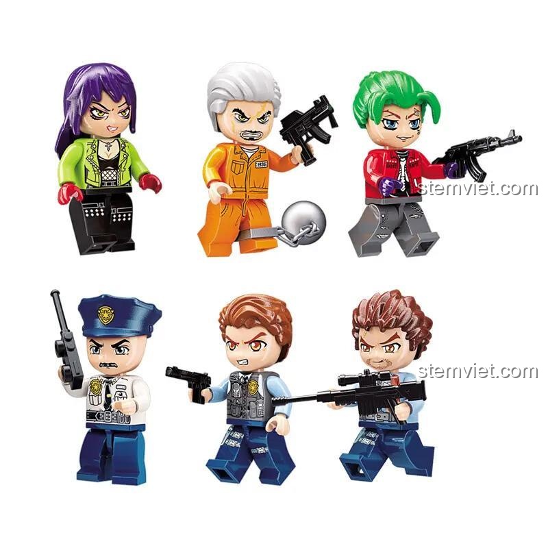 Bộ đồ chơi Sở Cảnh Sát Trọng Án Qman 1937 đi kèm 6 minifigure độc đáo, bao gồm các cảnh sát và tội phạm, giúp bé dễ dàng tạo ra các kịch bản nhập vai phong phú.