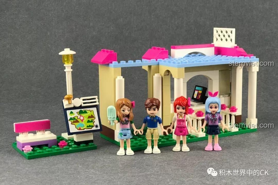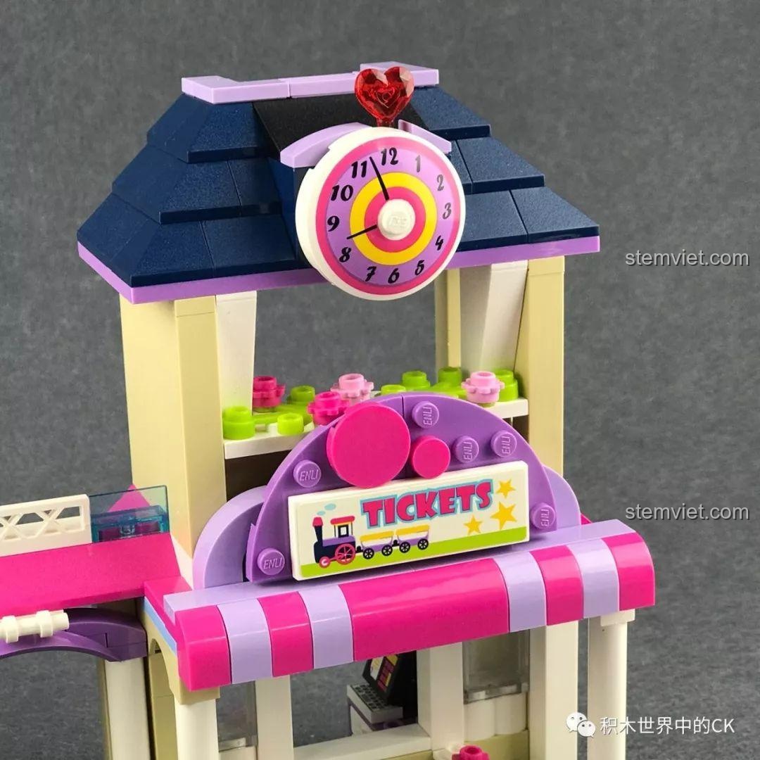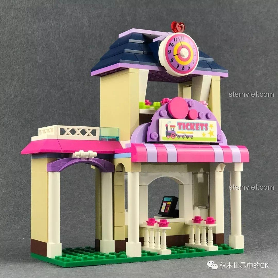 Ga tàu được thiết kế với quầy bán vé có mái hiên sọc hồng tím, một chiếc đồng hồ lớn in hình sắc nét, và khu vực nghỉ ngơi với ghế dài và đèn đường. Các minifigures Ryan, Emily, Shirley, và Abby đều có trang phục và biểu cảm riêng biệt, góp phần làm cho câu chuyện thêm phần sinh động. Dù kích thước mô hình không được cung cấp cụ thể, nhưng qua hình ảnh, bạn có thể thấy đây là một bộ đồ chơi có quy mô vừa phải, lý tưởng để bé tự tay lắp ráp và trưng bày.