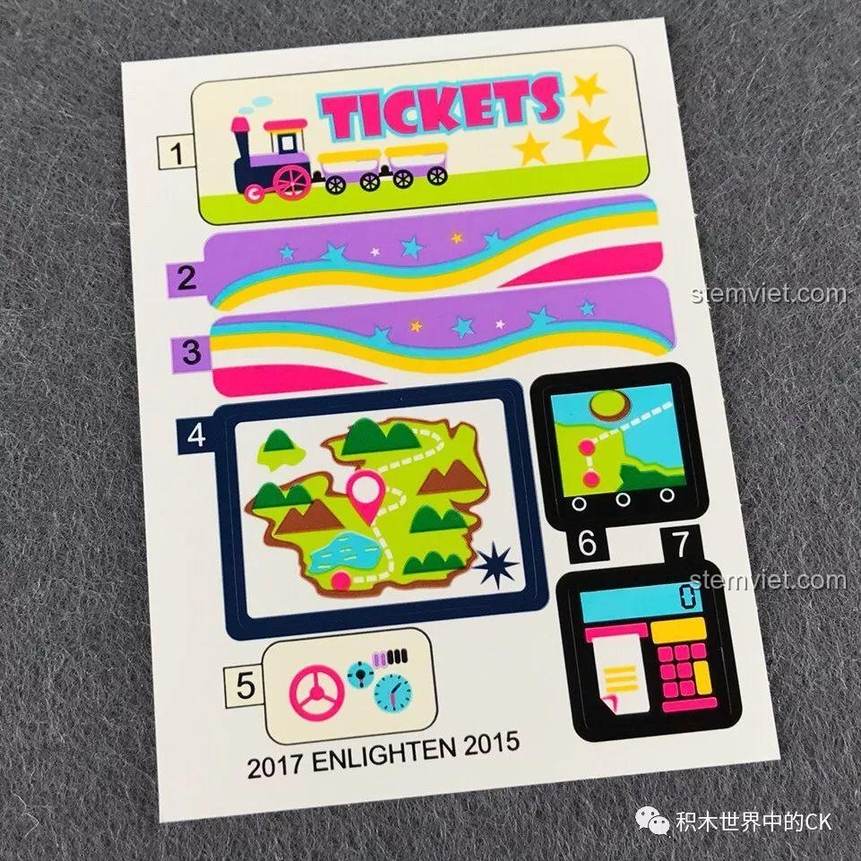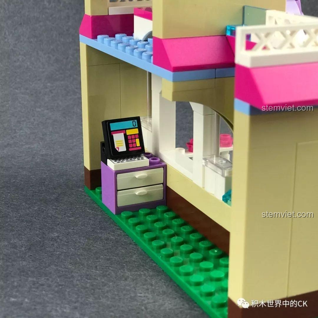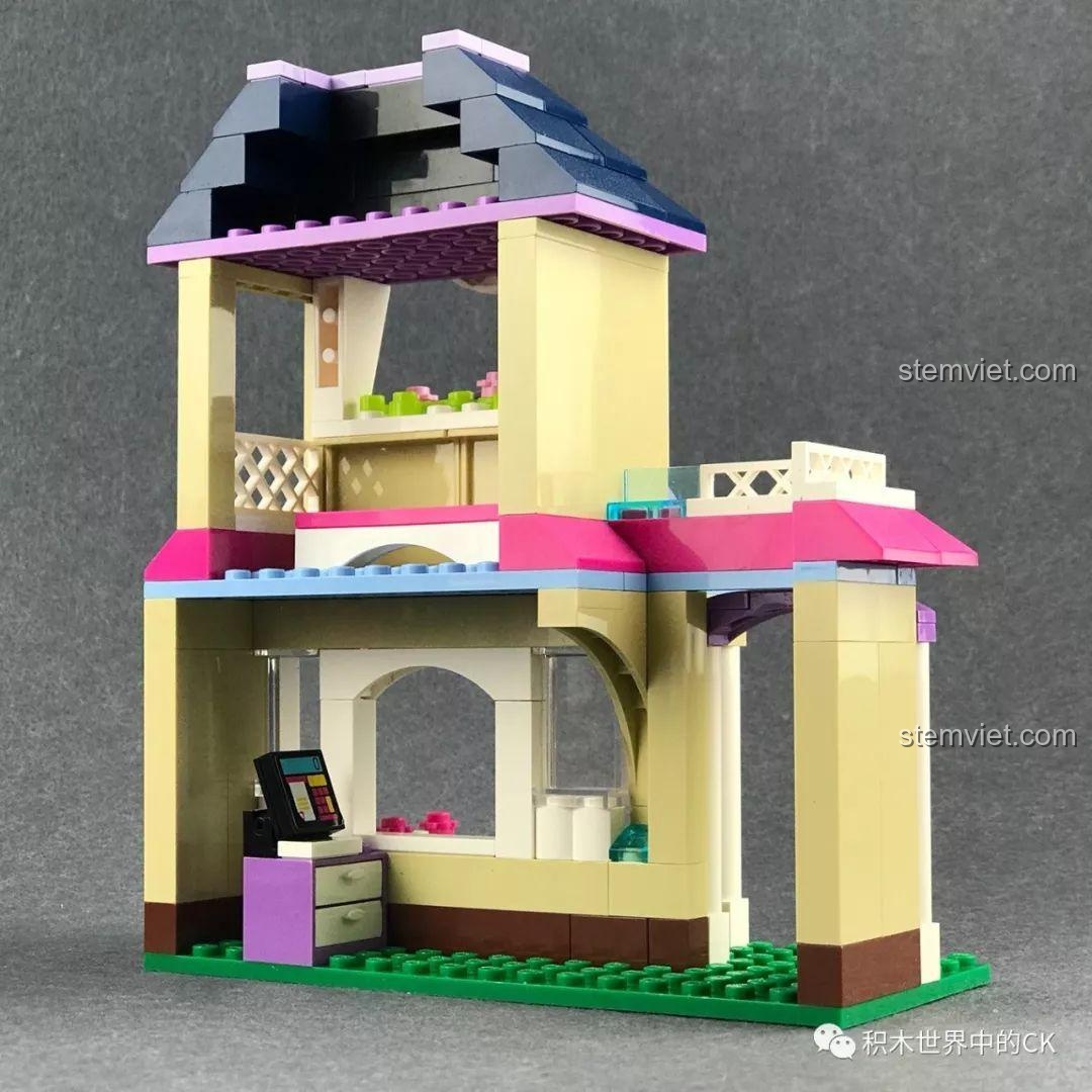 Ga tàu được thiết kế với quầy bán vé có mái hiên sọc hồng tím, một chiếc đồng hồ lớn in hình sắc nét, và khu vực nghỉ ngơi với ghế dài và đèn đường. Các minifigures Ryan, Emily, Shirley, và Abby đều có trang phục và biểu cảm riêng biệt, góp phần làm cho câu chuyện thêm phần sinh động. Dù kích thước mô hình không được cung cấp cụ thể, nhưng qua hình ảnh, bạn có thể thấy đây là một bộ đồ chơi có quy mô vừa phải, lý tưởng để bé tự tay lắp ráp và trưng bày.
