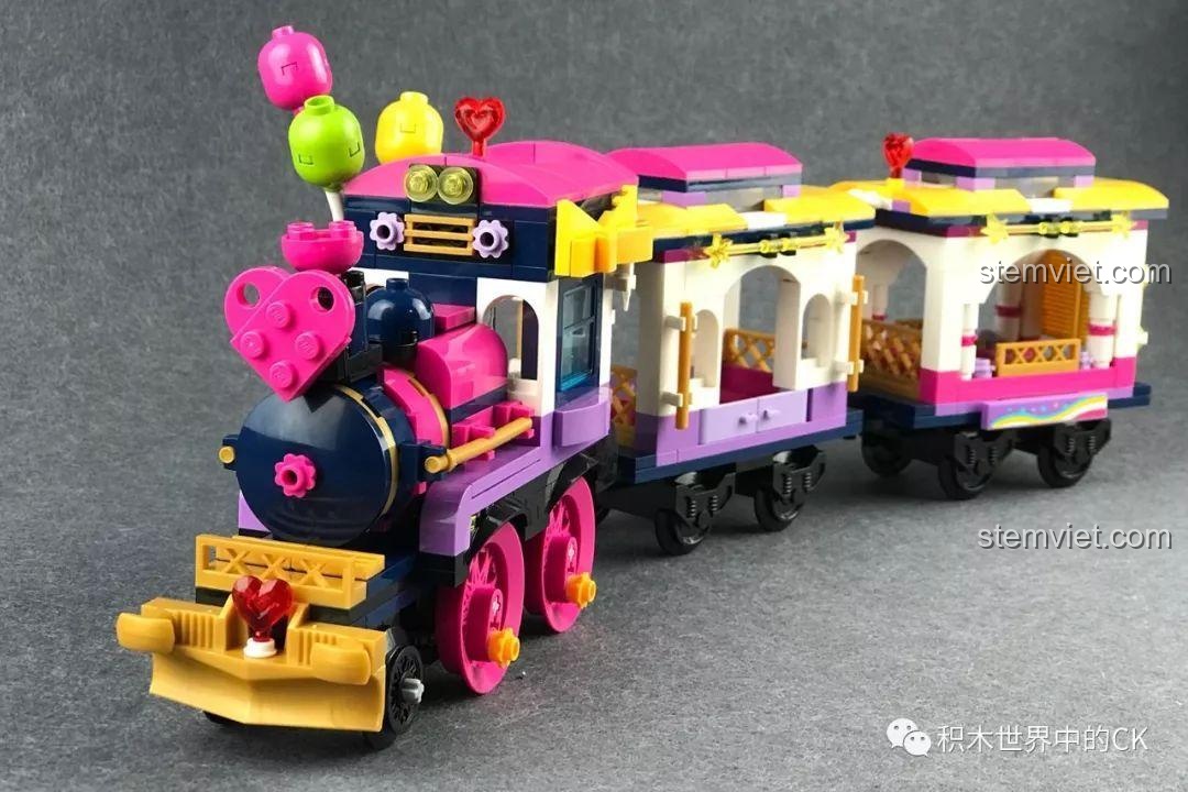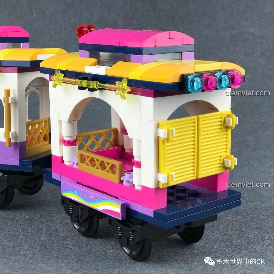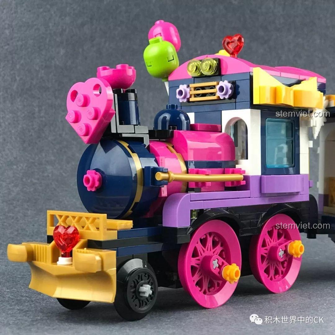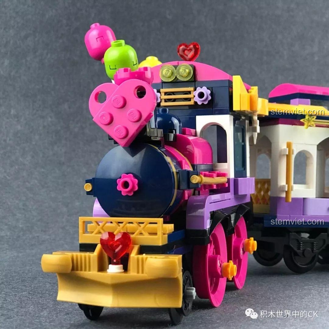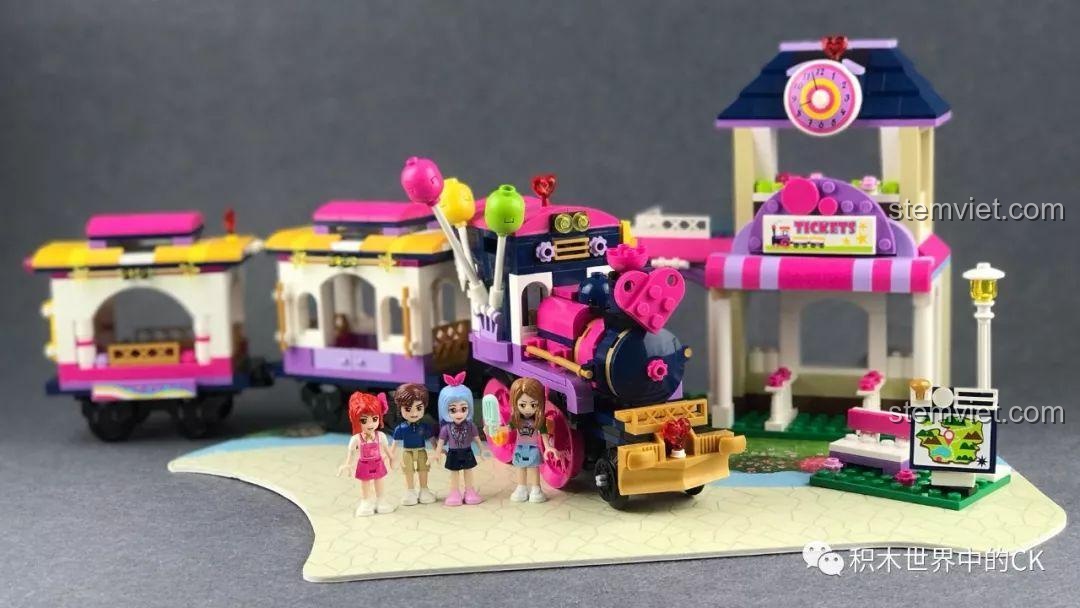 Bộ xếp hình Ga Tàu Hỏa này gây ấn tượng mạnh mẽ với thiết kế vô cùng đáng yêu và chi tiết tinh xảo. Từ đầu tàu rực rỡ với trái tim hồng và những chùm bóng bay ngộ nghĩnh, đến các toa tàu được trang trí công phu với cửa sổ vòm và ghế ngồi êm ái, mỗi phần đều toát lên vẻ đẹp sống động của một công viên giải trí thu nhỏ. Màu sắc chủ đạo là hồng, tím, vàng, xanh dương, trắng và xanh lá được phối hợp hài hòa, tạo nên một tổng thể tươi vui và bắt mắt, kích thích thị giác của bé.