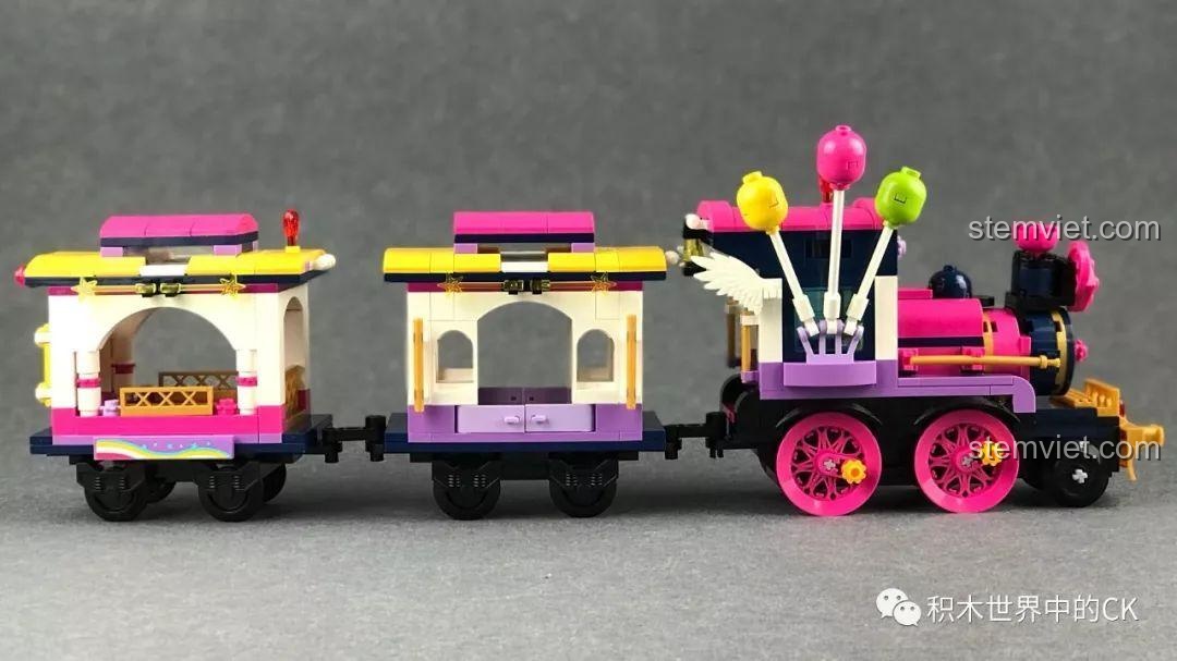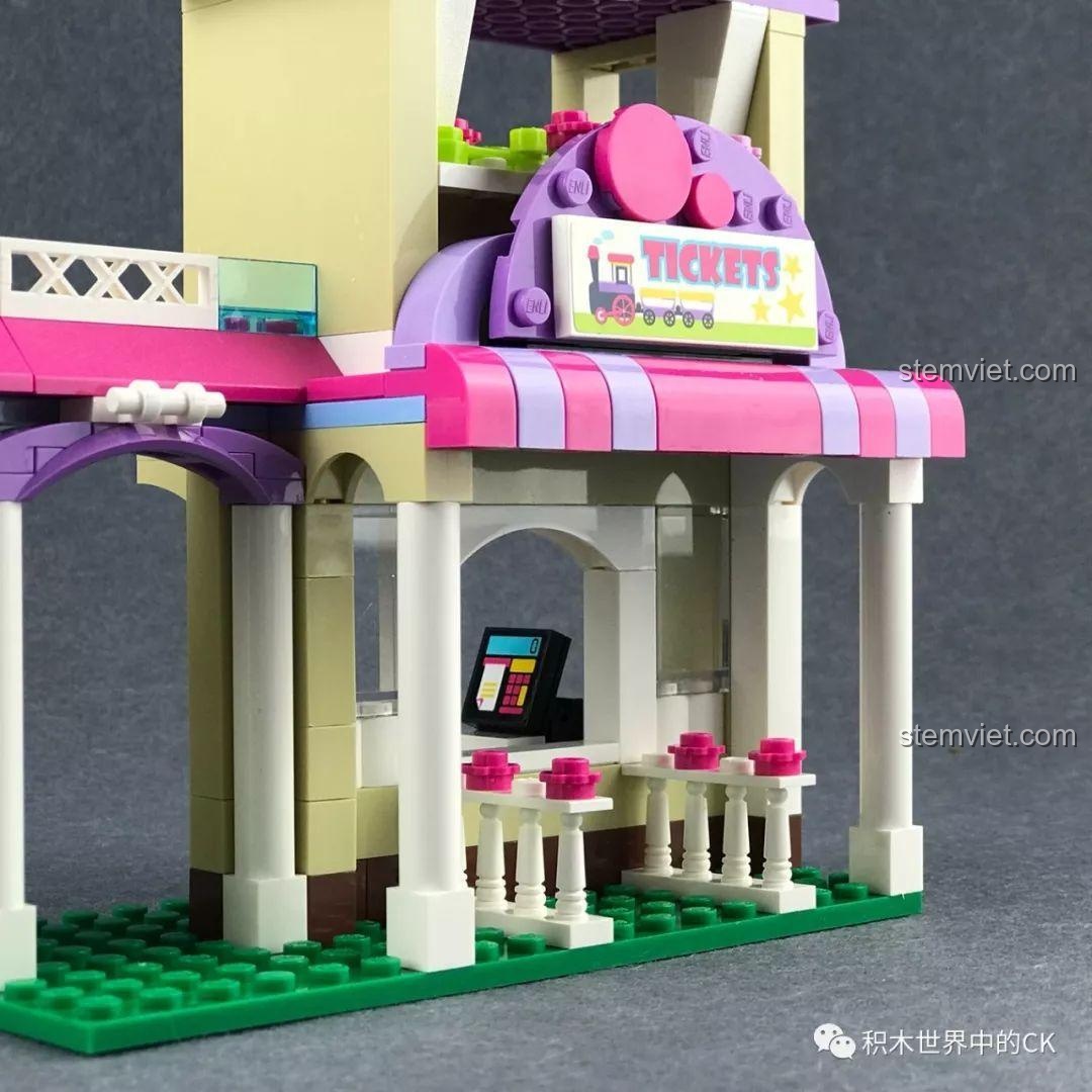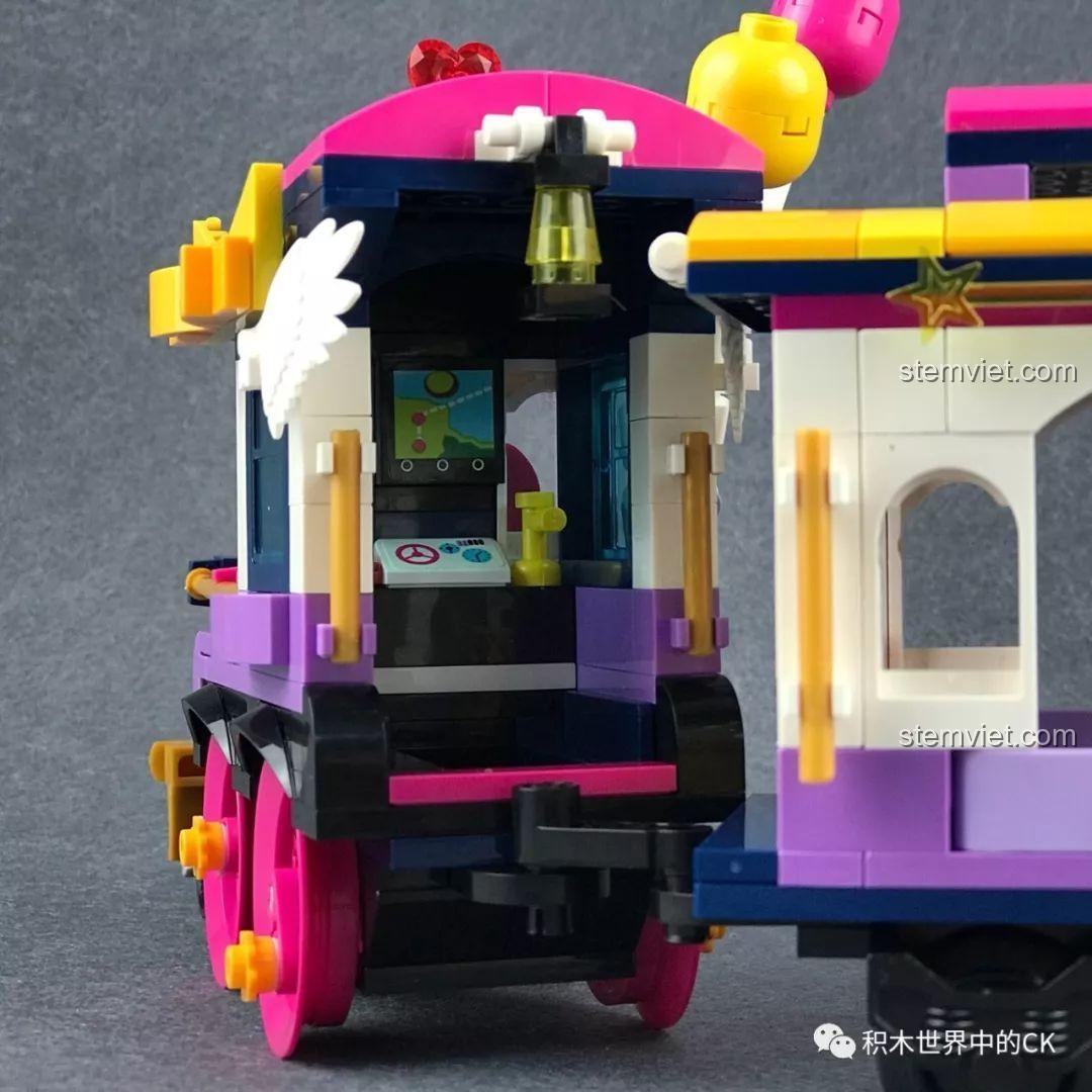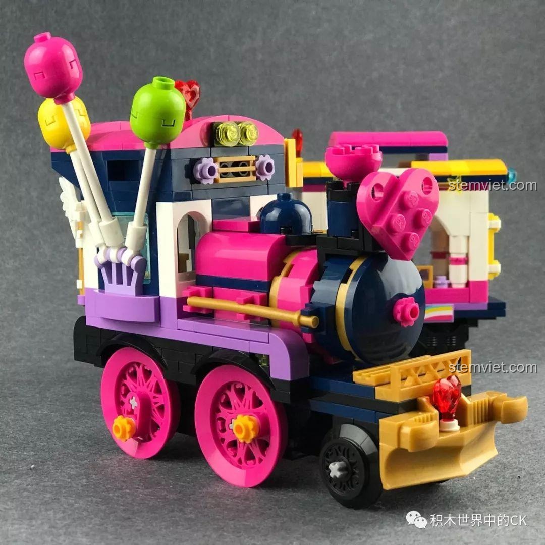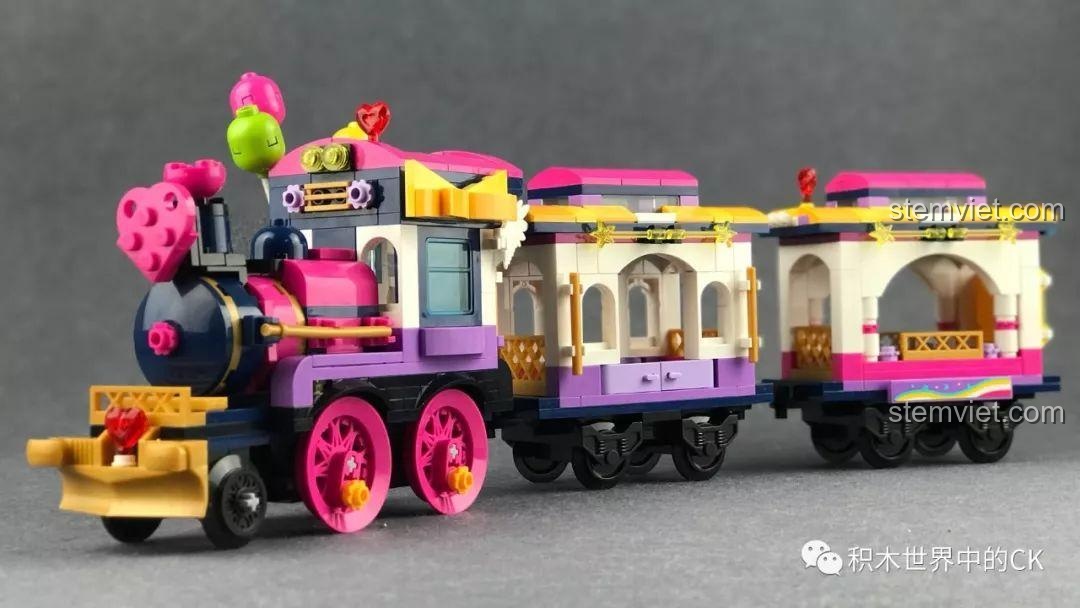 Bộ xếp hình Ga Tàu Hỏa này gây ấn tượng mạnh mẽ với thiết kế vô cùng đáng yêu và chi tiết tinh xảo. Từ đầu tàu rực rỡ với trái tim hồng và những chùm bóng bay ngộ nghĩnh, đến các toa tàu được trang trí công phu với cửa sổ vòm và ghế ngồi êm ái, mỗi phần đều toát lên vẻ đẹp sống động của một công viên giải trí thu nhỏ. Màu sắc chủ đạo là hồng, tím, vàng, xanh dương, trắng và xanh lá được phối hợp hài hòa, tạo nên một tổng thể tươi vui và bắt mắt, kích thích thị giác của bé.