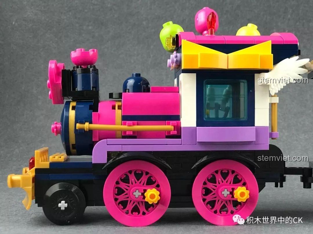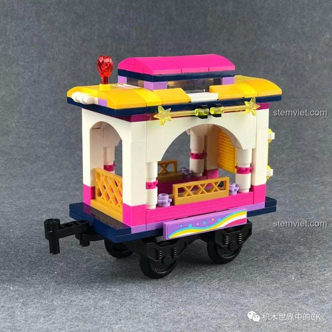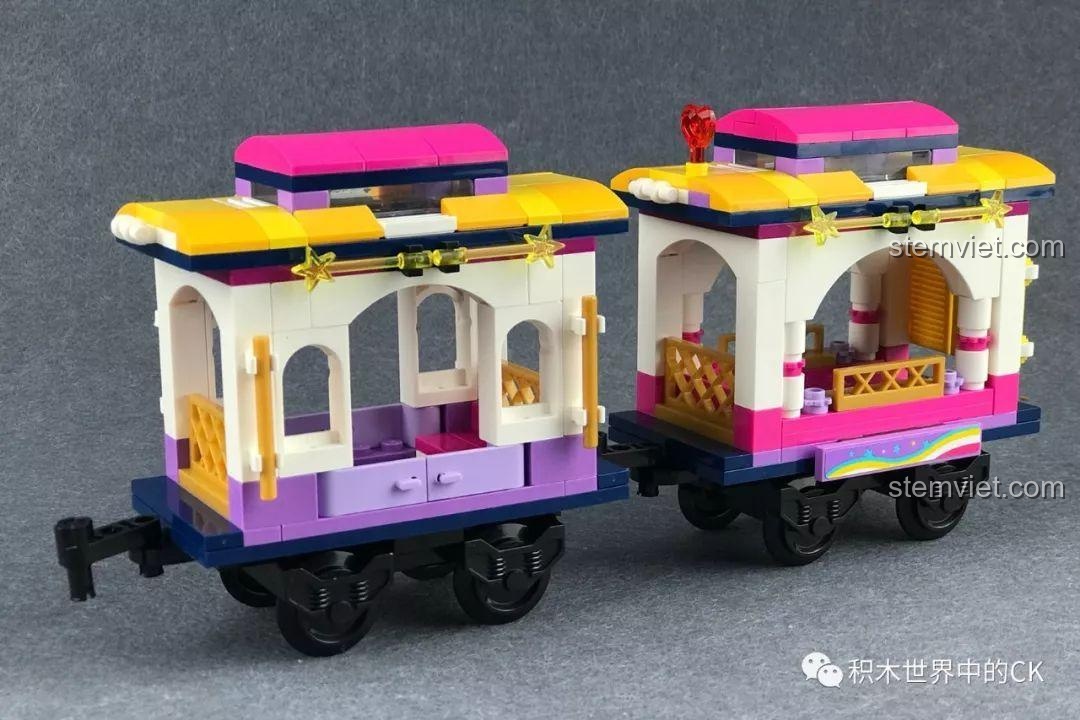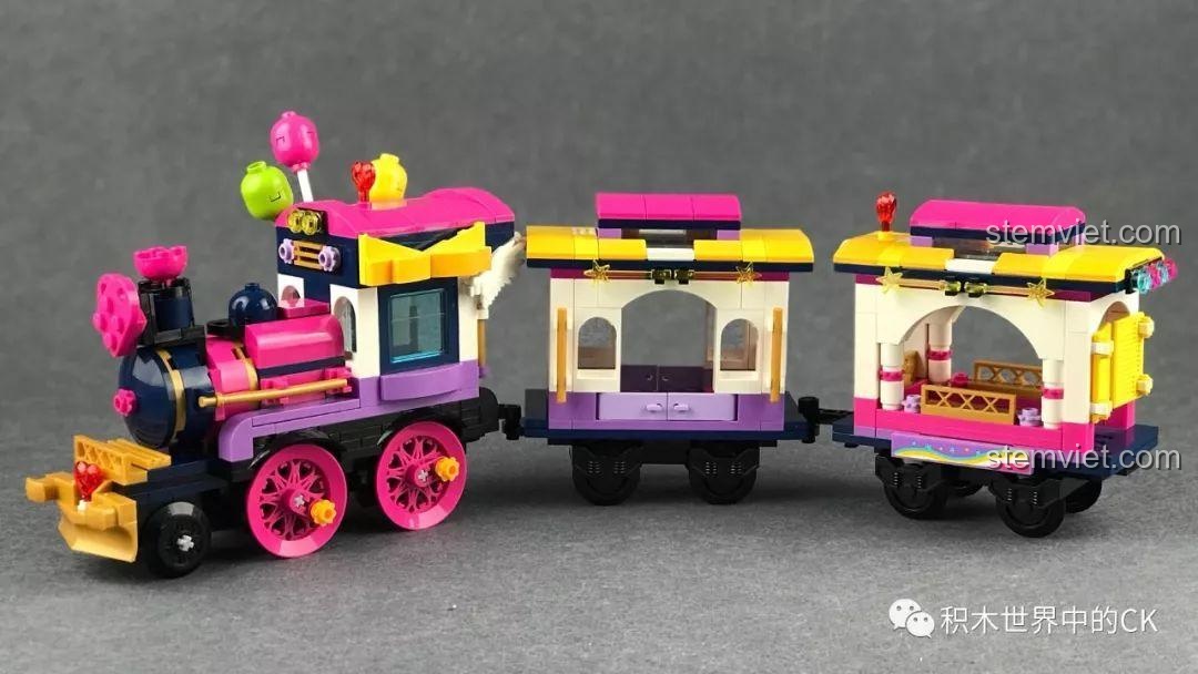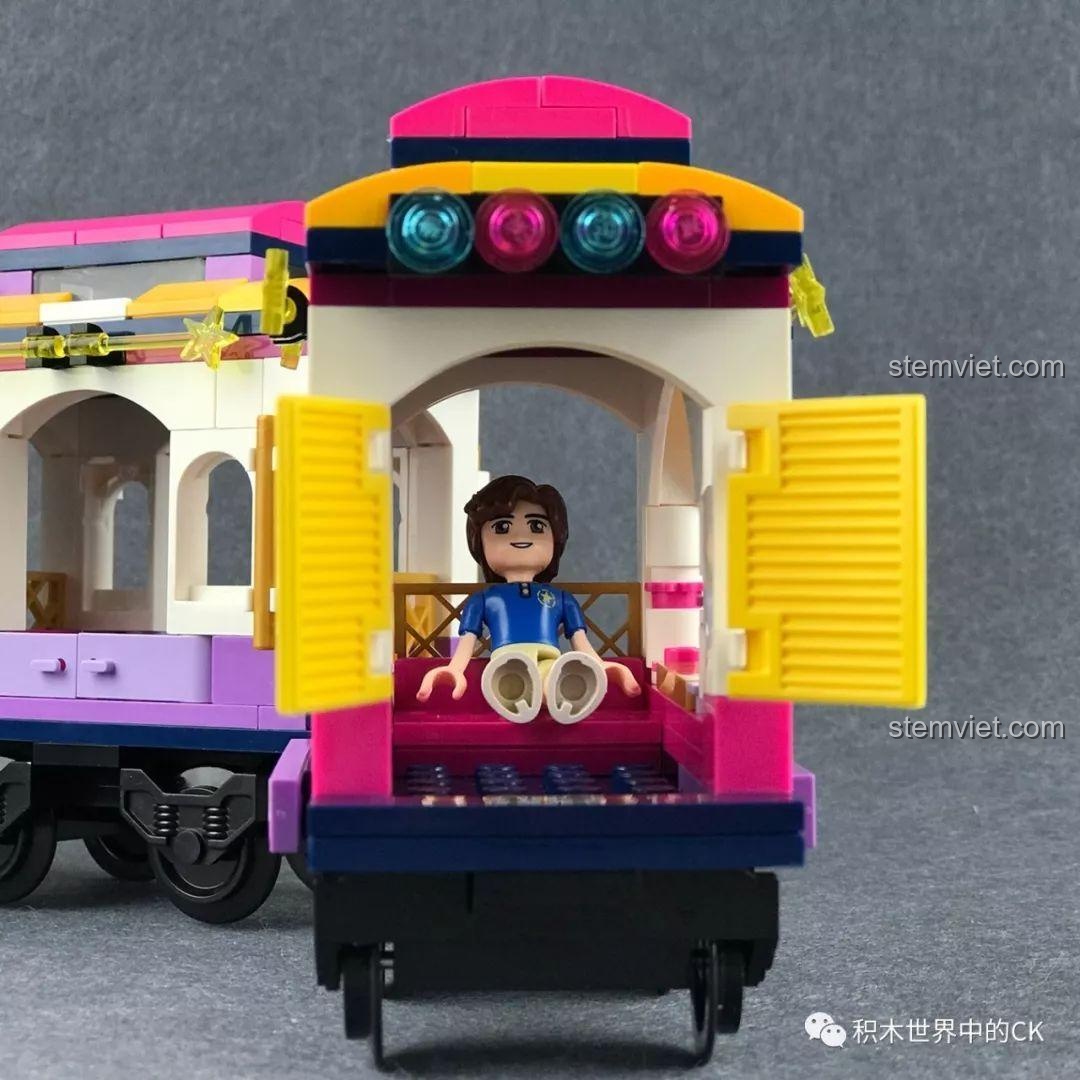 Bộ xếp hình Ga Tàu Hỏa này gây ấn tượng mạnh mẽ với thiết kế vô cùng đáng yêu và chi tiết tinh xảo. Từ đầu tàu rực rỡ với trái tim hồng và những chùm bóng bay ngộ nghĩnh, đến các toa tàu được trang trí công phu với cửa sổ vòm và ghế ngồi êm ái, mỗi phần đều toát lên vẻ đẹp sống động của một công viên giải trí thu nhỏ. Màu sắc chủ đạo là hồng, tím, vàng, xanh dương, trắng và xanh lá được phối hợp hài hòa, tạo nên một tổng thể tươi vui và bắt mắt, kích thích thị giác của bé.