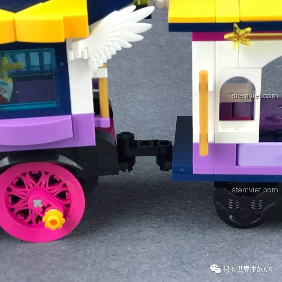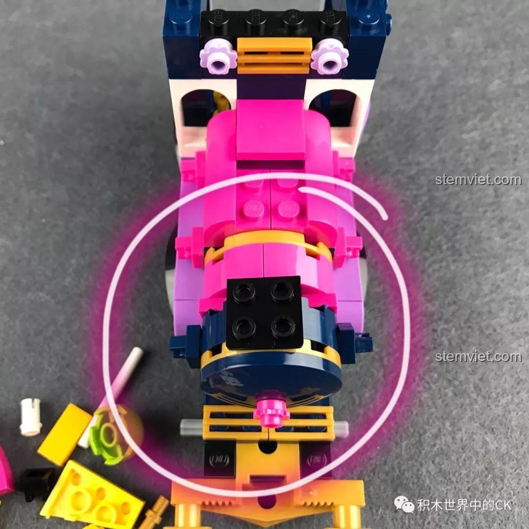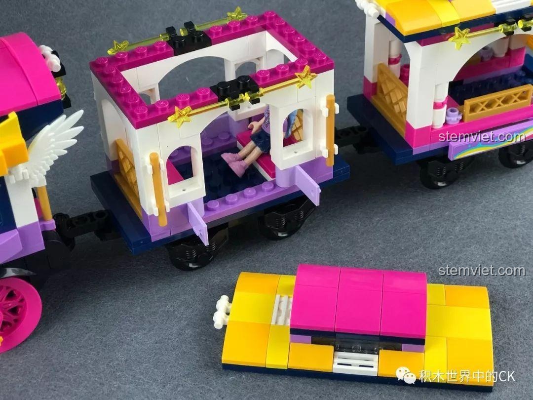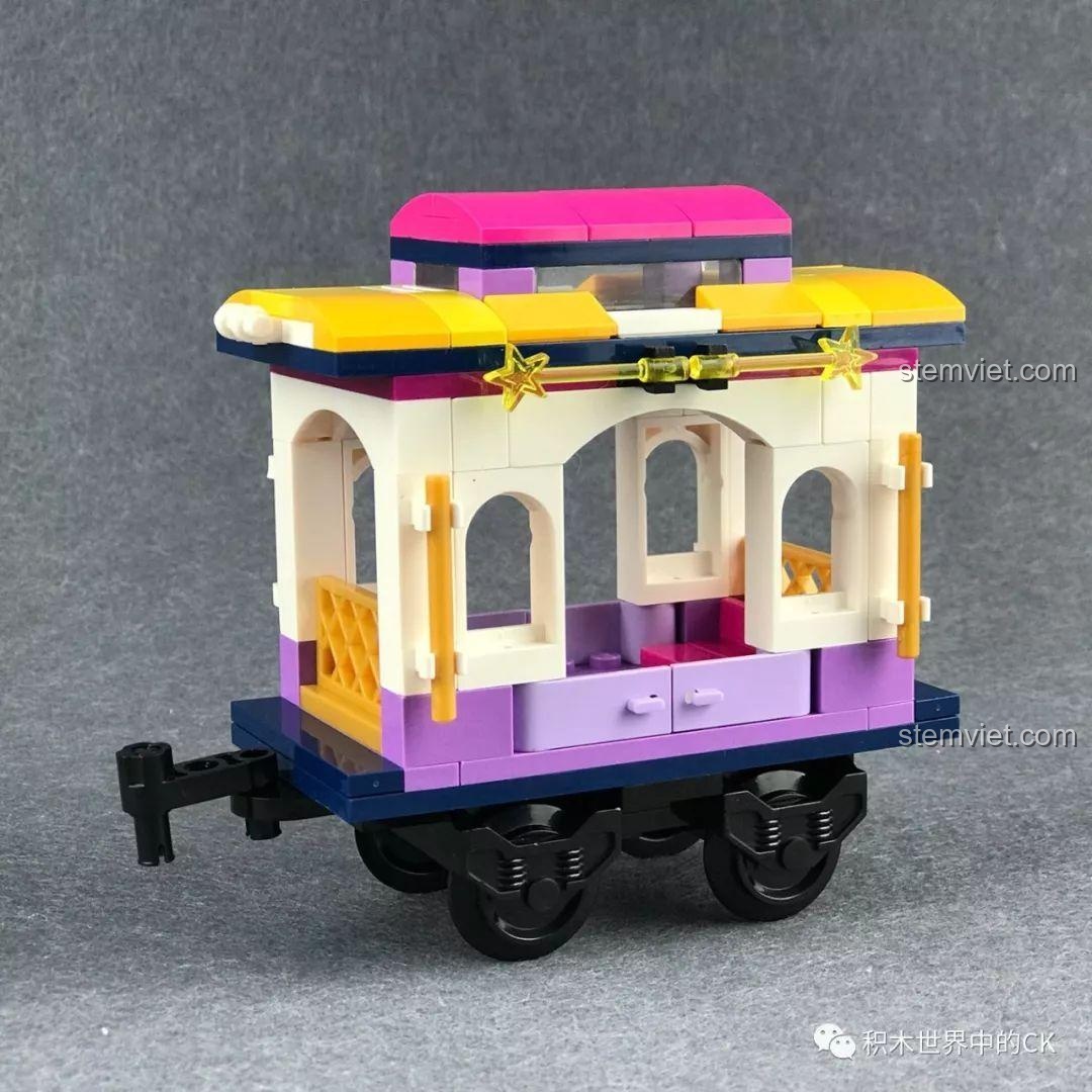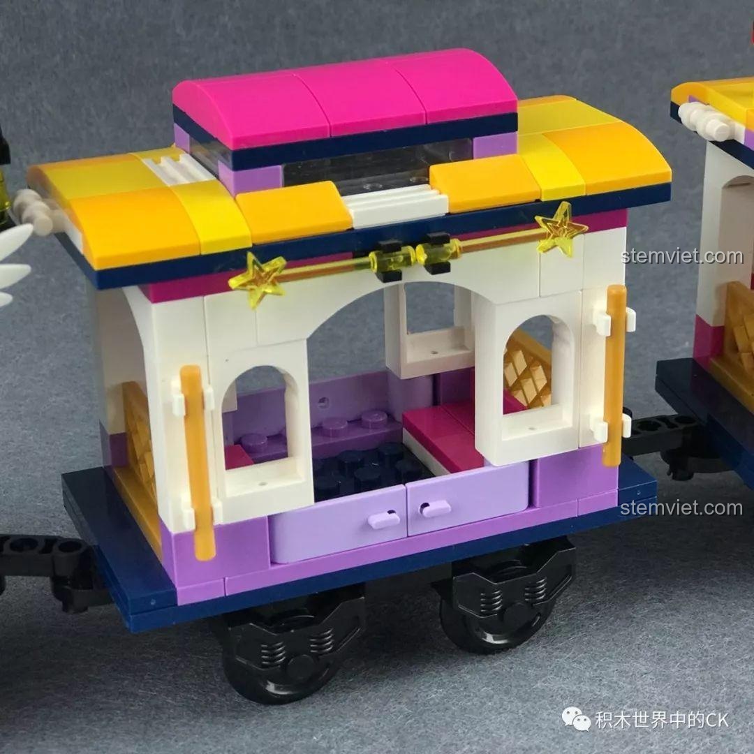 Bộ xếp hình Ga Tàu Hỏa này gây ấn tượng mạnh mẽ với thiết kế vô cùng đáng yêu và chi tiết tinh xảo. Từ đầu tàu rực rỡ với trái tim hồng và những chùm bóng bay ngộ nghĩnh, đến các toa tàu được trang trí công phu với cửa sổ vòm và ghế ngồi êm ái, mỗi phần đều toát lên vẻ đẹp sống động của một công viên giải trí thu nhỏ. Màu sắc chủ đạo là hồng, tím, vàng, xanh dương, trắng và xanh lá được phối hợp hài hòa, tạo nên một tổng thể tươi vui và bắt mắt, kích thích thị giác của bé.