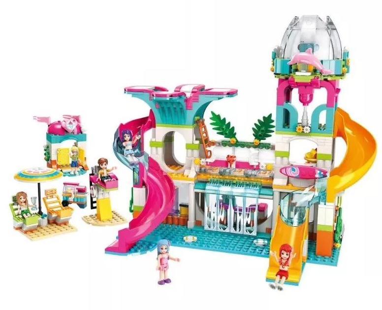 Ngay từ cái nhìn đầu tiên, các bé gái chắc chắn sẽ bị chinh phục bởi vẻ ngoài rực rỡ và chi tiết của bộ đồ chơi mô hình 2022 này. Với tông màu chủ đạo là hồng pastel, xanh ngọc và vàng nắng, mô hình tái hiện một khu vui chơi nước trong mơ. Điểm nhấn chính là hai đường trượt nước hoành tráng: một đường trượt xoắn ốc màu hồng đầy thử thách và một đường trượt thẳng màu vàng tốc độ. Tòa nhà trung tâm được thiết kế tinh xảo với khu vực bán vé, quầy giải khát và tầng thượng có mái vòm trong suốt độc đáo. Xung quanh là khu vực bãi biển với ghế nằm, ô che nắng và cả một ván lướt sóng sành điệu. Đặc biệt, bộ sản phẩm đi kèm 5 nhân vật búp bê mini (minidoll) với trang phục mùa hè xinh xắn, sẵn sàng cho mọi hoạt động vui chơi, giúp bé dễ dàng nhập vai và kể chuyện.