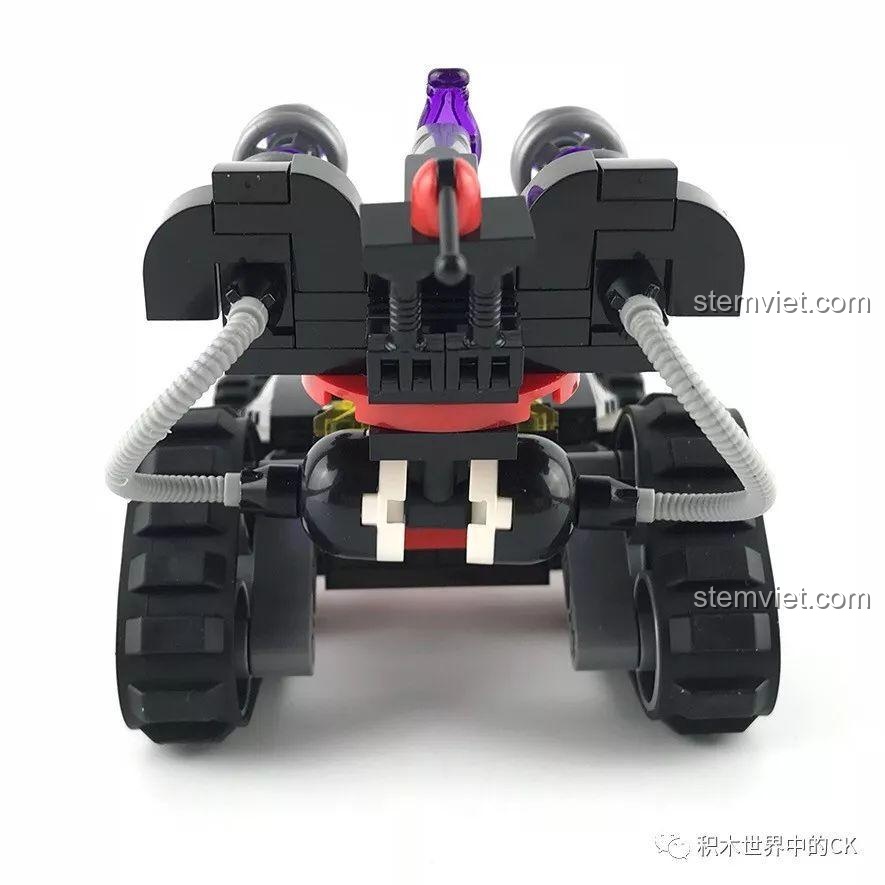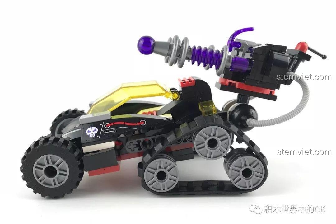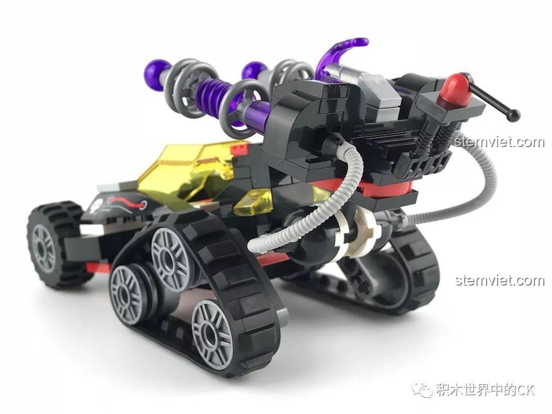 Ngay từ cái nhìn đầu tiên, Pháo Bắn Tỉa Từ Trường đã gây ấn tượng mạnh mẽ với vẻ ngoài hầm hố và đầy uy lực. Đây không phải là một chiếc xe tăng thông thường. Các nhà thiết kế của QMAN đã tạo ra một cỗ máy chiến tranh độc đáo với hệ thống di chuyển “lai” – nửa bánh lốp phía trước để tăng tốc linh hoạt, nửa bánh xích phía sau để vượt mọi địa hình hiểm trở. Toàn bộ xe được bao phủ bởi tông màu đen và xám huyền bí, điểm xuyết bằng những chi tiết màu tím năng lượng và buồng lái kính vàng trong suốt, tạo nên một tổng thể đậm chất khoa học viễn tưởng. Trái tim của cỗ máy này chính là khẩu pháo từ trường kép khổng lồ, với các cuộn dây năng lượng màu tím sẵn sàng khai hỏa. Bên cạnh đó, bộ sản phẩm còn đi kèm một máy bay không người lái nhỏ gọn nhưng không kém phần tinh xảo, là trợ thủ đắc lực cho phe anh hùng.
