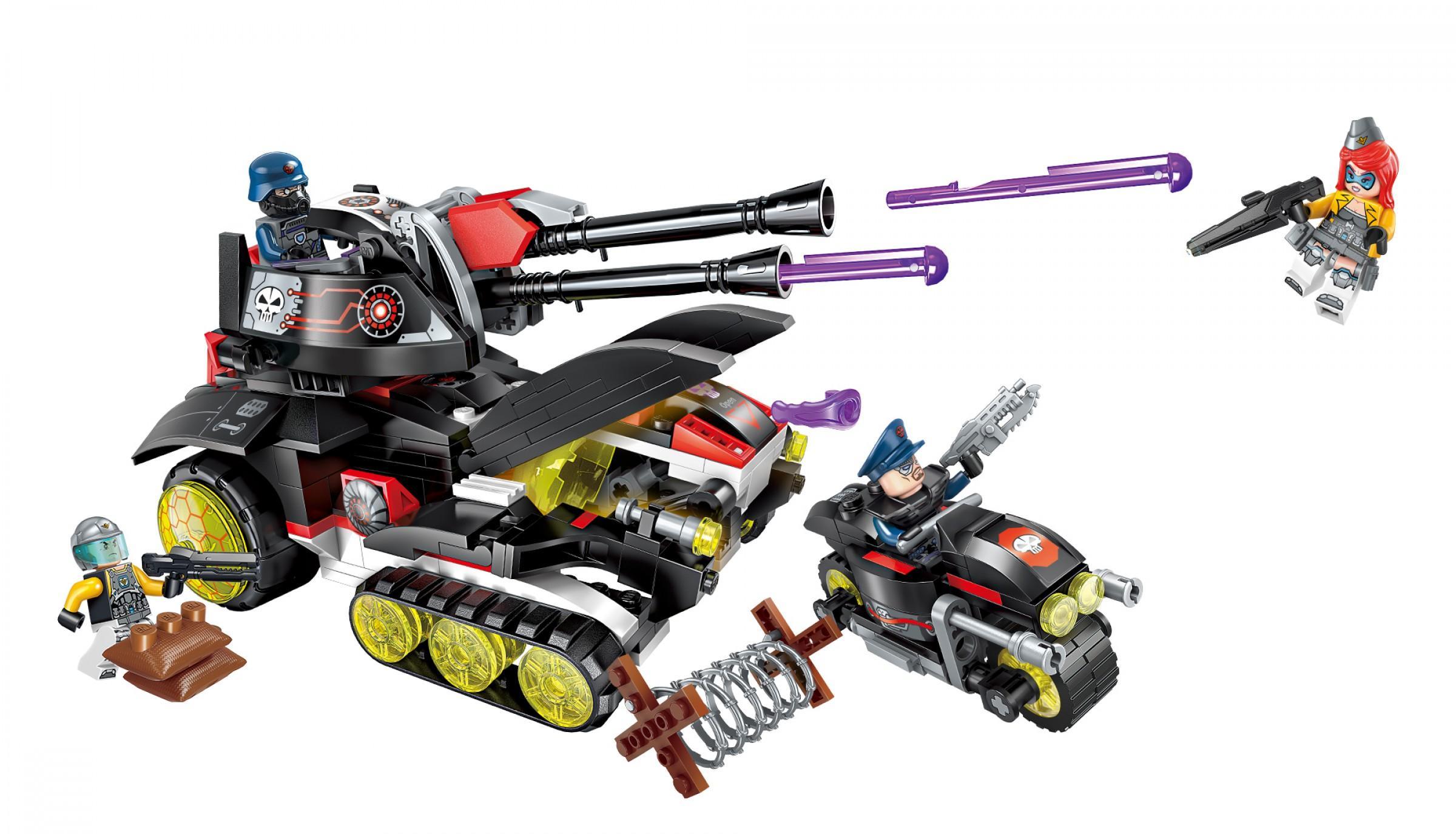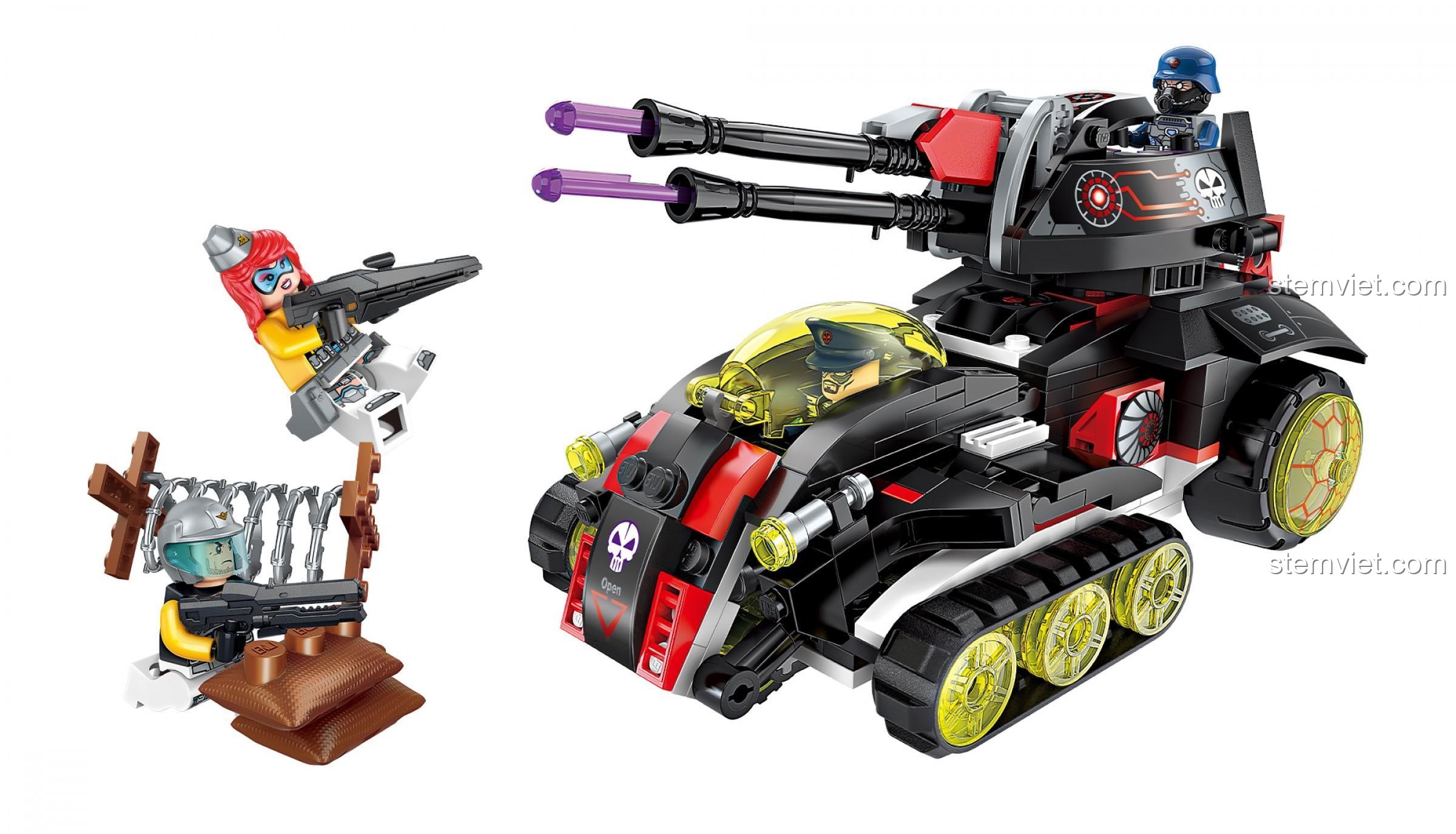 Ngay từ cái nhìn đầu tiên, đồ chơi mô hình QMAN 2715 đã gây ấn tượng mạnh mẽ với thiết kế đậm chất tương lai. Tông màu chủ đạo đen-đỏ-trắng kết hợp hài hòa, tạo nên vẻ ngoài vừa bí ẩn vừa mạnh mẽ. Điểm độc đáo nằm ở cấu trúc nửa bánh xích, nửa bánh lốp, mang lại cảm giác về một cỗ máy chiến tranh vừa cơ động trên mọi địa hình, vừa có tốc độ vượt trội. Các chi tiết như buồng lái trong suốt màu vàng, các hoạ tiết đầu lâu và mạch điện được in sắc nét trên thân xe, cùng cặp nòng pháo đôi dài đầy uy lực, tất cả đều góp phần tạo nên một tổng thể hoàn hảo, chi tiết. Với 399 mảnh ghép, bé sẽ được trải nghiệm quá trình lắp ráp một mô hình phức tạp, từ đó rèn luyện sự kiên nhẫn và khả năng quan sát tỉ mỉ. Đây chắc chắn là một mô hình mà bất kỳ cậu bé 6 tuổi nào cũng tự hào khi trưng bày trong góc học tập của mình.