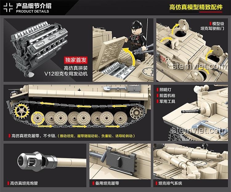 Mô hình có rất nhiều tính năng thú vị: tháp pháo xoay 360 độ, nòng pháo nâng hạ được, xích xe chuyển động mượt mà khi đẩy, các nắp khoang trên xe có thể mở ra để xem chi tiết bên trong, và đi kèm 6 minifigures lính Đức cùng rất nhiều vũ khí.