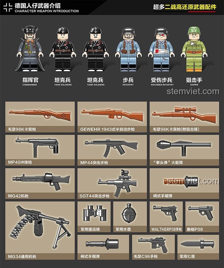Bộ sản phẩm đi kèm đến 6 nhân vật lính Đức được trang bị đầy đủ, bao gồm: 1 chỉ huy, 2 lính tăng, 1 bộ binh, 1 bộ binh bị thương và 1 lính bắn tỉa. Điều này giúp bé có thể tái hiện một kíp lái xe tăng hoàn chỉnh và các tình huống chiến đấu đa dạng.