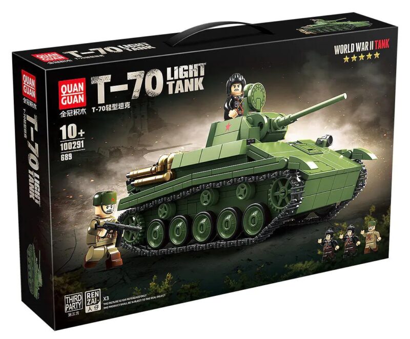 Bộ lắp ráp Xe tăng hạng nhẹ T-70 QUAN GUAN 100291 bao gồm 689 mảnh ghép chi tiết.