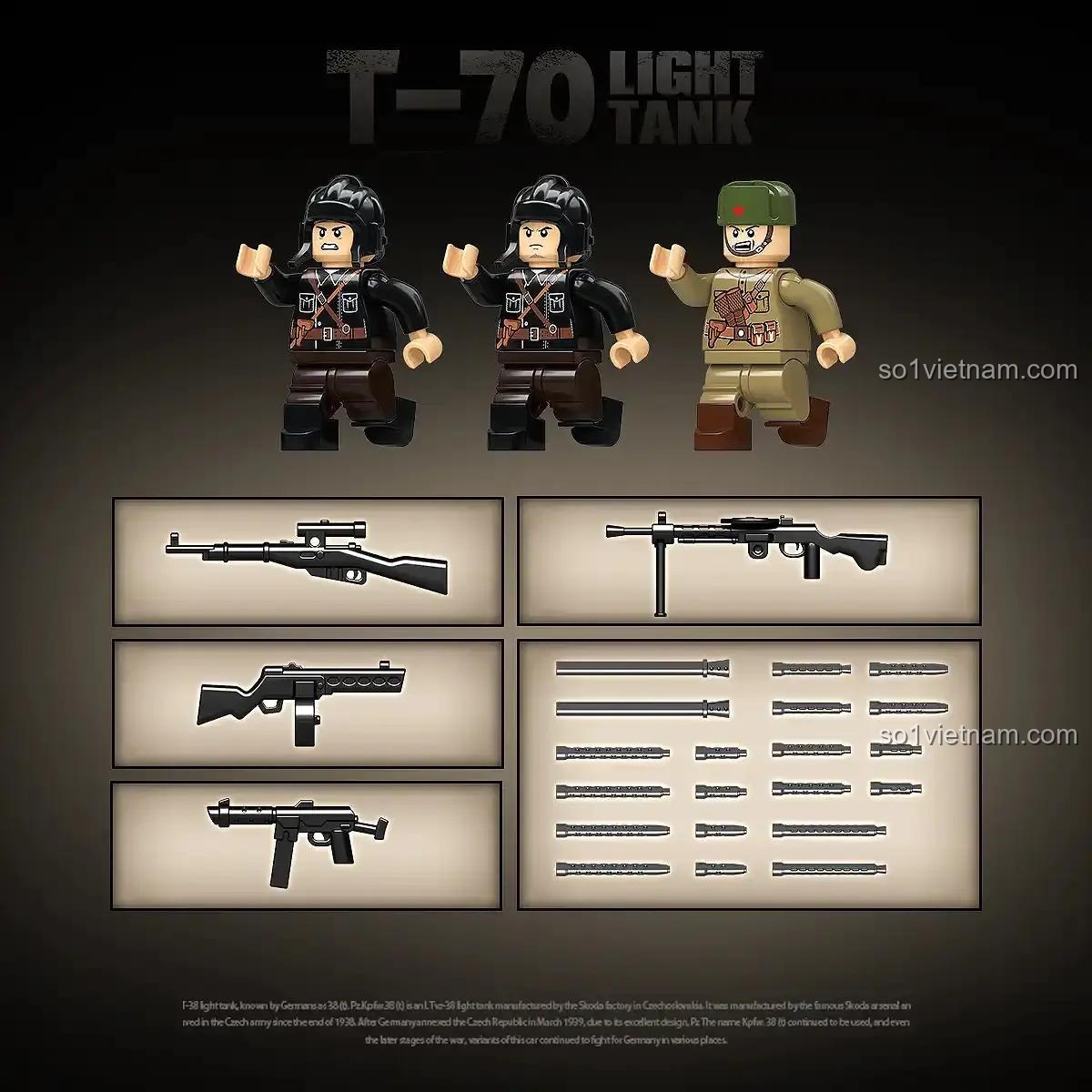 Bộ lắp ráp Xe tăng hạng nhẹ T-70 QUAN GUAN 100291 có tháp pháo xoay 360 độ, thân xe tháo rời để khám phá nội thất chi tiết, cùng với các minifigures và vũ khí đi kèm.