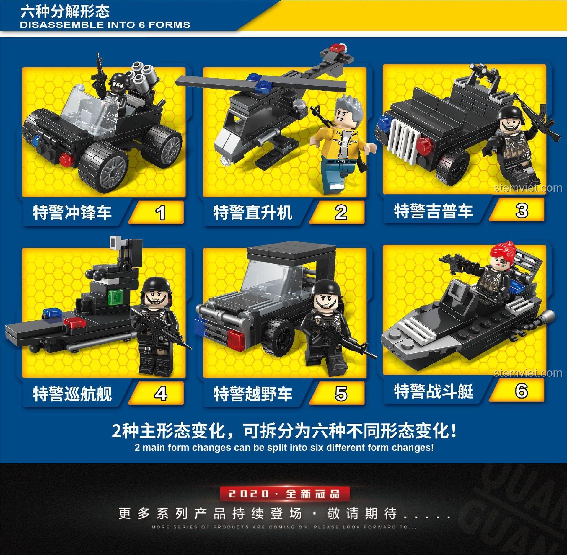 Bộ đồ chơi lắp ráp SWAT Mobile Team (Mã: 100047) của thương hiệu QUANGUAN là một bộ mô hình đa năng, cho phép bé thỏa sức sáng tạo với 6 phương tiện SWAT khác nhau. Với 454 mảnh ghép chất lượng cao, bé có thể xây dựng nên: