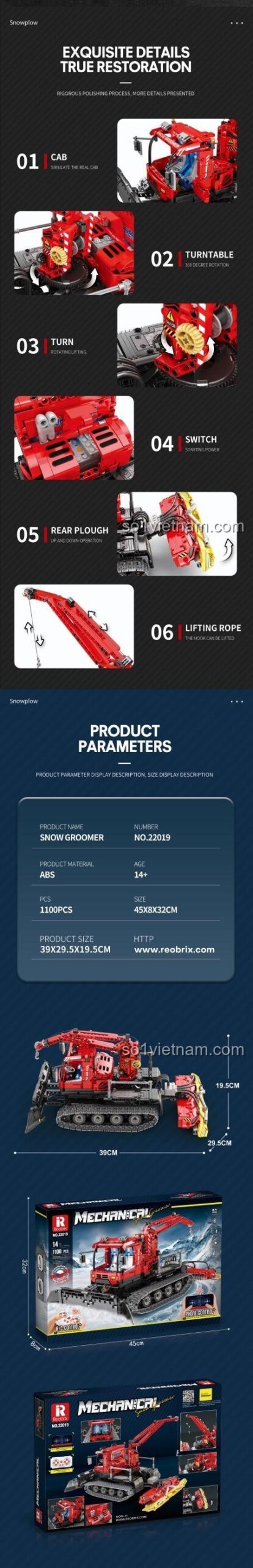 Ra mắt vào năm 2022, bộ lắp ghép Xe Tuyết Cần Cẩu Reobrix 22019 thuộc dòng sản phẩm “Mechanical” (Cơ khí) của Reobrix, một thương hiệu nổi tiếng với các bộ mô hình kỹ thuật phức tạp và chất lượng cao. Lấy cảm hứng từ những chiếc xe chuyên dụng hoạt động trong môi trường khắc nghiệt, bộ mô hình này tái hiện chân thực hình ảnh một chiếc xe lu tuyết đa năng, được trang bị cần cẩu mạnh mẽ, sẵn sàng chinh phục mọi địa hình băng tuyết.