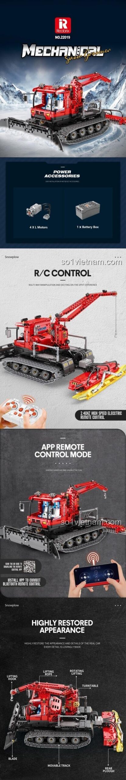 Điểm nhấn đặc biệt của bộ mô hình này là khả năng điều khiển qua ứng dụng điện thoại, cần cẩu xoay 360 độ, lưỡi cào tuyết có thể điều chỉnh và hệ thống bánh xích di chuyển linh hoạt, mang đến trải nghiệm chân thực và thú vị.