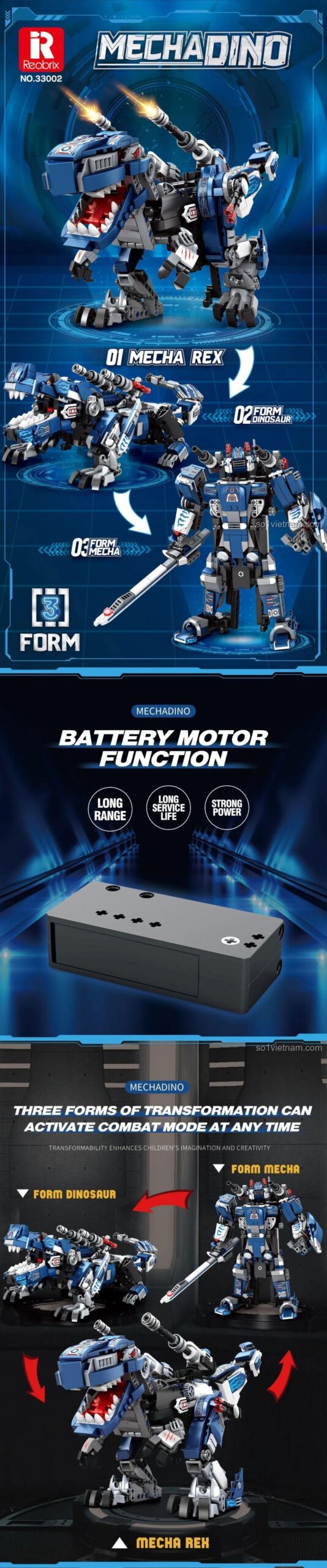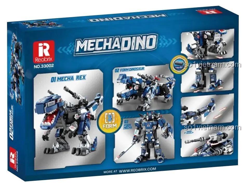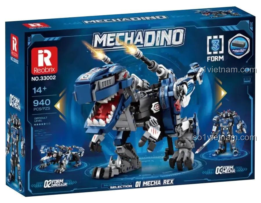 Bộ đồ chơi Reobrix 33002 Mecha Rex có tổng cộng 940 chi tiết và cho phép bé lắp ráp thành 3 dạng khác nhau: Khủng long máy, Khủng long và Robot chiến đấu.