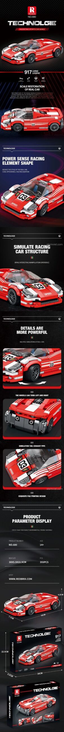 Siêu xe Porsche 917 Reobrix không chỉ là một mô hình tĩnh để ngắm nhìn. Nó còn chứa đựng những tính năng tương tác thú vị, làm tăng thêm giá trị trải nghiệm cho người chơi. Hệ thống bánh xe được thiết kế thông minh, cho phép bạn có thể điều khiển chúng xoay trái, xoay phải một cách mượt mà, mô phỏng chân thực chuyển động của một chiếc xe thật. Các chi tiết nhỏ như ống xả, đèn pha, và logo ’03’ đặc trưng đều được chăm chút kỹ lưỡng, mang lại một tổng thể hài hòa và sống động. Quá trình lắp ráp với các chi tiết tương thích LEGO® tiêu chuẩn cũng là một hành trình khám phá cơ khí đầy hấp dẫn. Bạn sẽ được tự tay mình ‘chế tạo’ nên một huyền thoại, hiểu rõ hơn về cấu trúc và nguyên lý của một chiếc xe đua, từ đó khơi dậy niềm đam mê khoa học và kỹ thuật.