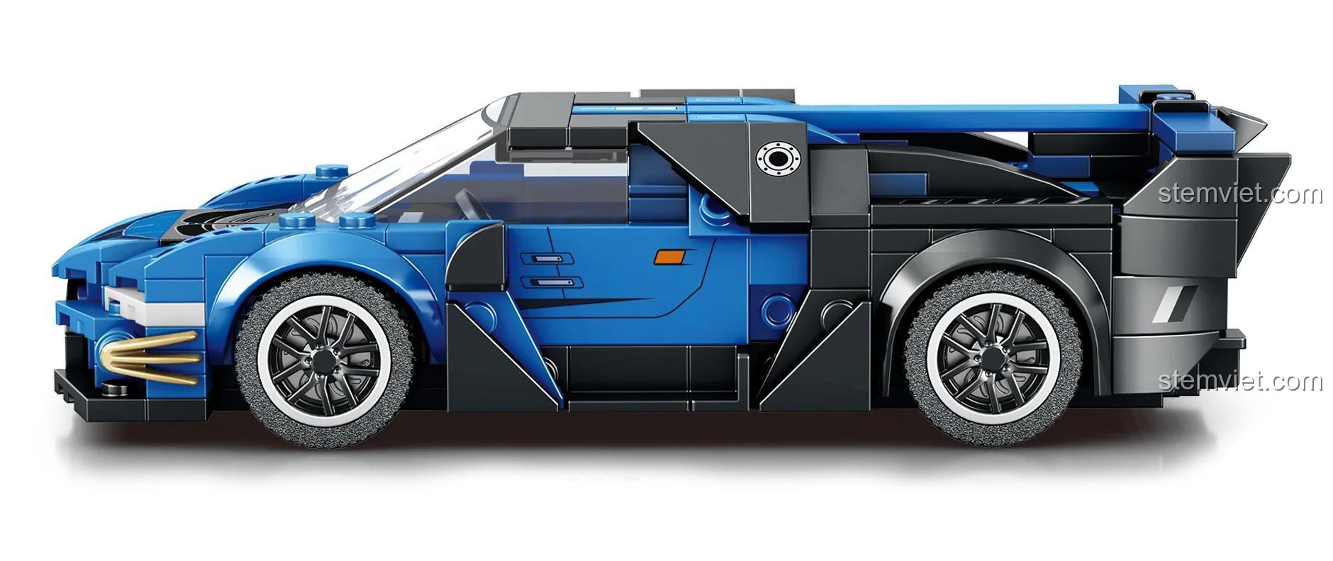 Ngay từ cái nhìn đầu tiên, mô hình Xe đua Bugatti Vision GT Reobrix đã chinh phục mọi ánh nhìn bằng vẻ ngoài cực kỳ ấn tượng. Khoác lên mình bộ cánh hai tông màu Xanh dương và Đen mạnh mẽ, chiếc xe toát lên vẻ đẹp của một chiến binh đường đua thực thụ. Từng đường nét trên thân xe đều được tính toán kỹ lưỡng để tối ưu hóa khí động học, từ hốc hút gió phía trước, đường gân dập nổi chạy dọc thân xe, cho đến cánh gió sau khổng lồ – tất cả đều được tái hiện một cách chân thực và tỉ mỉ. Với kích thước dài 18.5 cm, rộng 8.5 cm và cao 4.7 cm sau khi hoàn thành, mô hình có một vóc dáng cân đối, hoàn hảo để trưng bày trên bàn học hay trong bộ sưu tập. Các chi tiết nhỏ như logo, bộ khuếch tán sau và cụm đèn đều được chăm chút, tạo nên một tổng thể hài hòa, một kiệt tác đường đua thu nhỏ đầy cuốn hút.