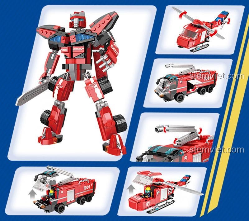 Điểm đặc biệt nhất của bộ đồ chơi Robot Biến Hình Forange FC1001 là khả năng biến hình thành 3 dạng: Robot, Xe cứu hỏa và Trực thăng cứu hỏa, mang đến trải nghiệm chơi đa dạng và thú vị.