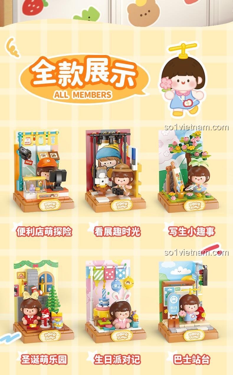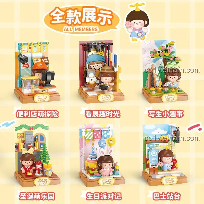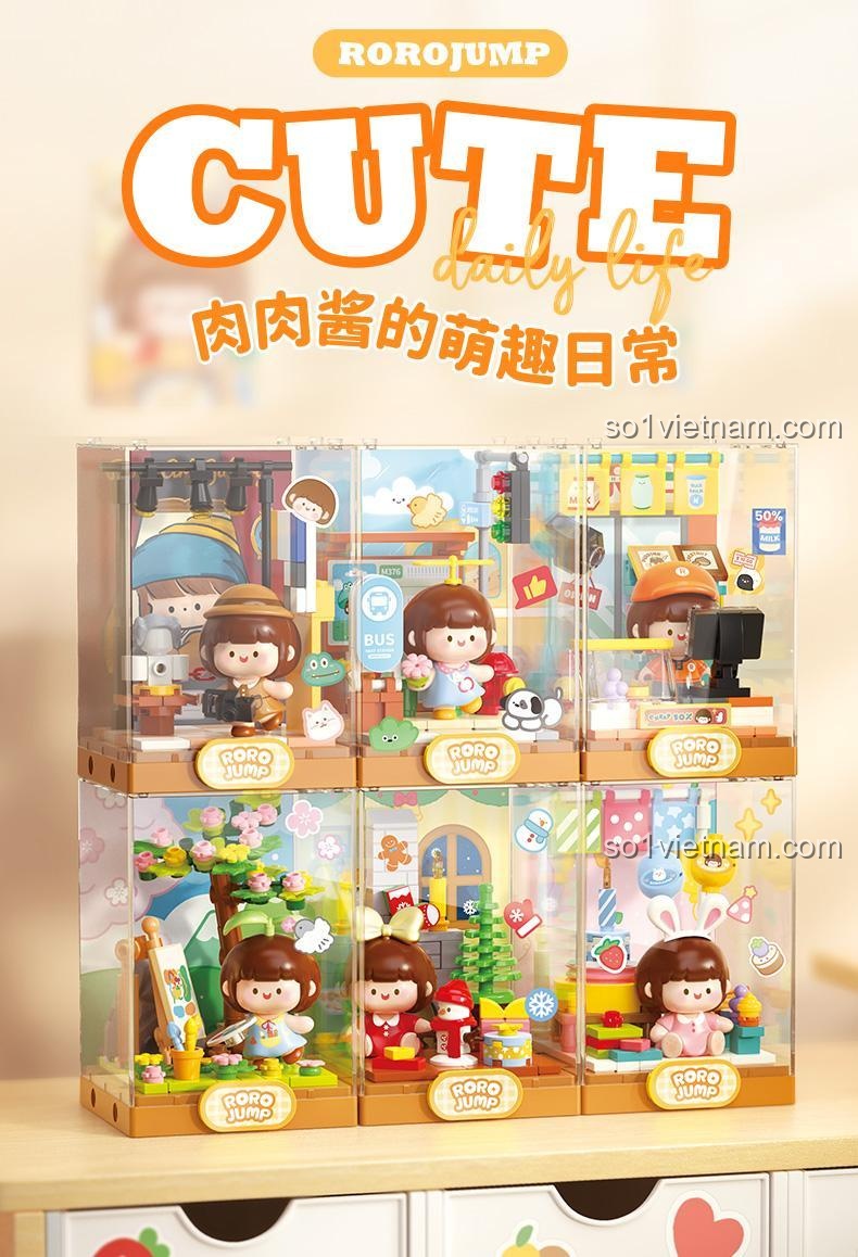 - 6 Mẫu Nhân Vật Đa Dạng: Mỗi mô hình là một câu chuyện, một cảnh tượng trong cuộc sống hàng ngày của Rou Rou Jiang, từ cửa hàng tiện lợi, câu lạc bộ thời trang đến khu vườn xanh mát hay buổi tiệc sinh nhật ấm áp.