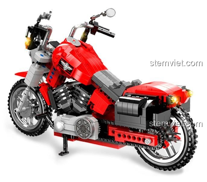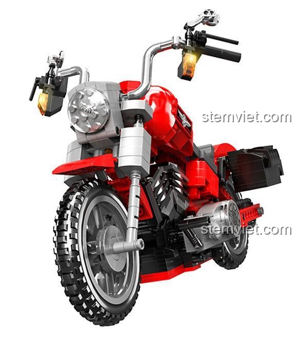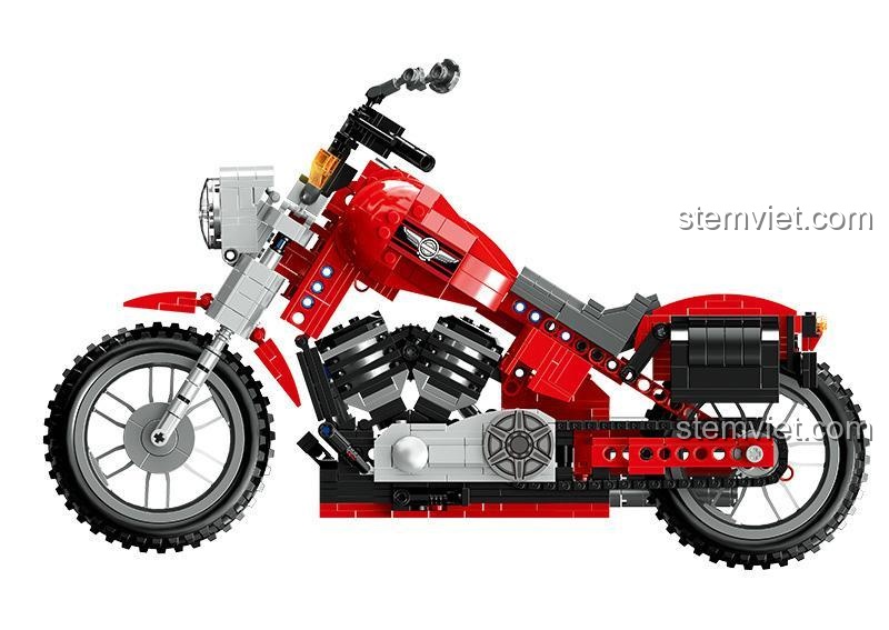 Ngay từ cái nhìn đầu tiên, bộ xếp hình 840 đã chinh phục mọi ánh nhìn bởi vẻ ngoài hầm hố, đậm chất cruiser cổ điển. Khoác lên mình bộ cánh đỏ rực rỡ kết hợp với sắc đen mạnh mẽ và các chi tiết mạ chrome sáng bóng, mô hình toát lên một vẻ đẹp vừa hoang dã vừa lịch lãm. Với kích thước ấn tượng dài 36.5 cm và cao 22.1 cm, cùng tỉ lệ 1:8, chiếc xe trông cực kỳ bề thế và chân thực. Mọi chi tiết đều được tái hiện một cách tỉ mỉ: từ ghi-đông cao đặc trưng, bình xăng hình giọt nước, yên xe solo cho đến cặp vành đúc khỏe khoắn. Đặc biệt, khối động cơ V-Twin – trái tim của mọi chiếc Harley – được mô phỏng cực kỳ chi tiết, phô bày vẻ đẹp cơ khí đầy mê hoặc. Đây chắc chắn sẽ là một mô hình trưng bày đầy kiêu hãnh trong bộ sưu tập của bé.