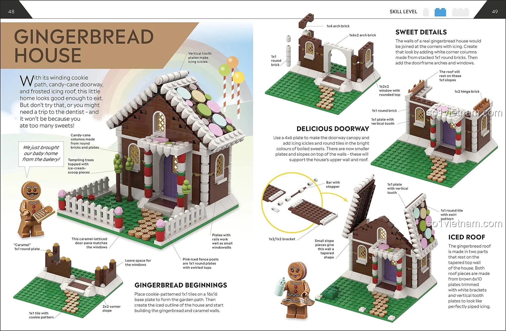 Bước vào thế giới của sách lắp ghép nhà LEGO, bé sẽ được chiêm ngưỡng một bộ sưu tập “Hơn 30 Mẫu Nhà” đa dạng, từ những ngôi nhà gỗ (Log Cabin) mộc mạc bên hồ, những căn nhà phố (Townhouse) hiện đại, đến ngôi nhà bánh gừng (Gingerbread House) ngọt ngào hay thậm chí là một ngôi nhà ma (Haunted House) đầy bí ẩn. Mỗi mô hình đều được trình bày với hình ảnh minh họa sống động và rõ nét, giúp bé dễ dàng hình dung và tái tạo.