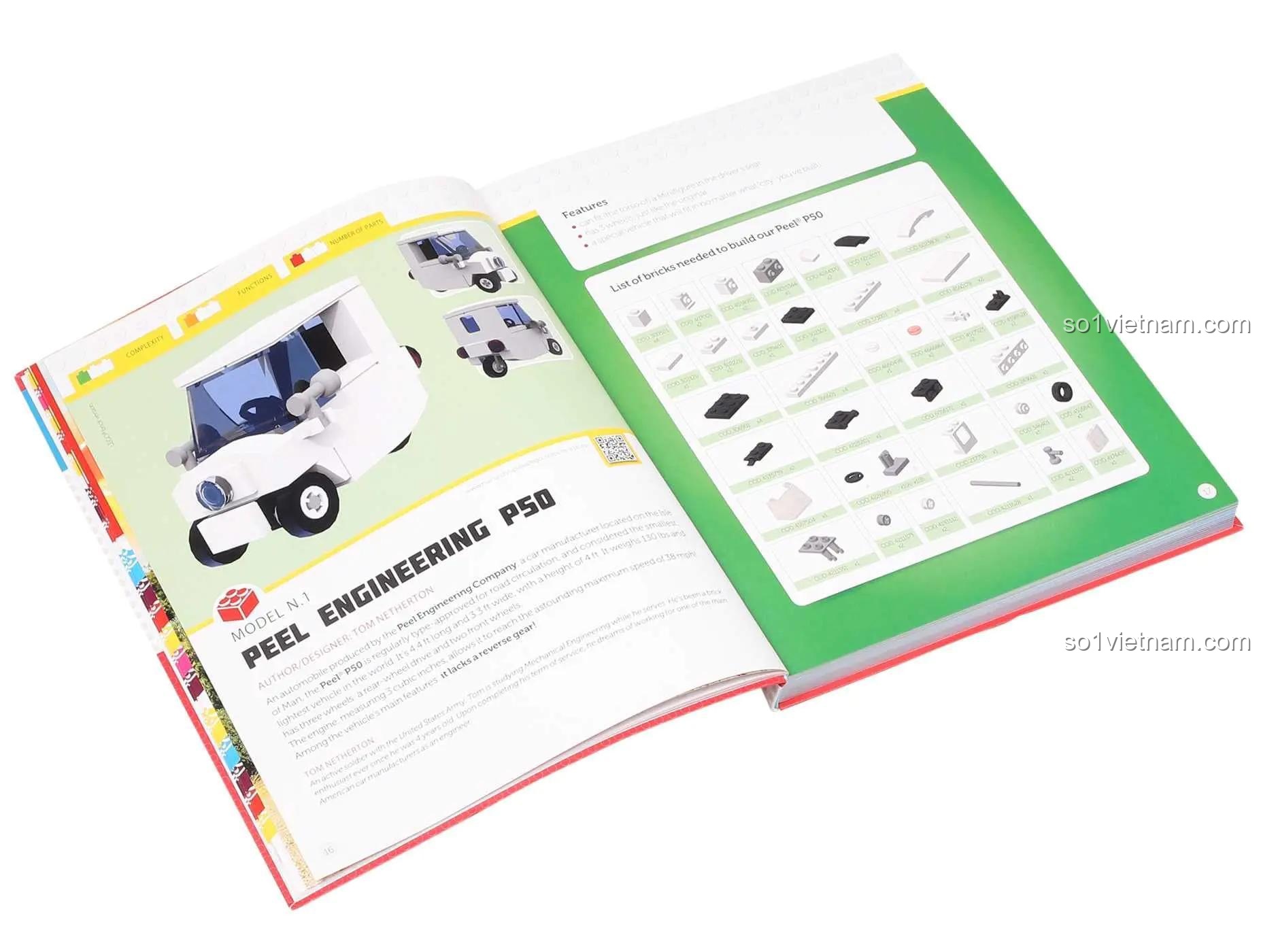 Cuốn Sách hướng dẫn xây dựng phương tiện Thunder Bay Press này gây ấn tượng mạnh mẽ với thiết kế bìa màu sắc nổi bật: Đỏ, Vàng, Xanh dương và Trắng, thu hút ngay từ cái nhìn đầu tiên. Bên trong, các trang sách được trình bày một cách khoa học và trực quan, giúp bé trai 8 tuổi dễ dàng theo dõi từng bước lắp ráp. Cuốn sách không chỉ hướng dẫn cách lắp ráp một mẫu duy nhất, mà còn giới thiệu đến 8 mẫu lắp được khác nhau, từ những chiếc xe Peel P50 nhỏ gọn đến trực thăng, máy bay và thuyền, mang đến sự đa dạng và không ngừng khám phá.