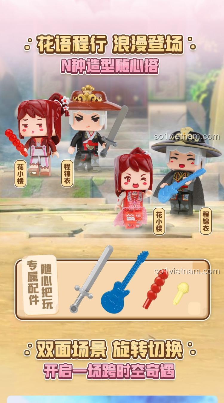 Dạ, bộ sản phẩm này có tổng cộng 4 minifigures ạ. Thực chất là 2 nhân vật chính Hoa Tiểu Lâu và Trình Cẩm Y, nhưng mỗi nhân vật lại có thêm một bộ trang phục và phụ kiện khác nhau để thay đổi, giúp câu chuyện của bé thêm phần phong phú và đa dạng.