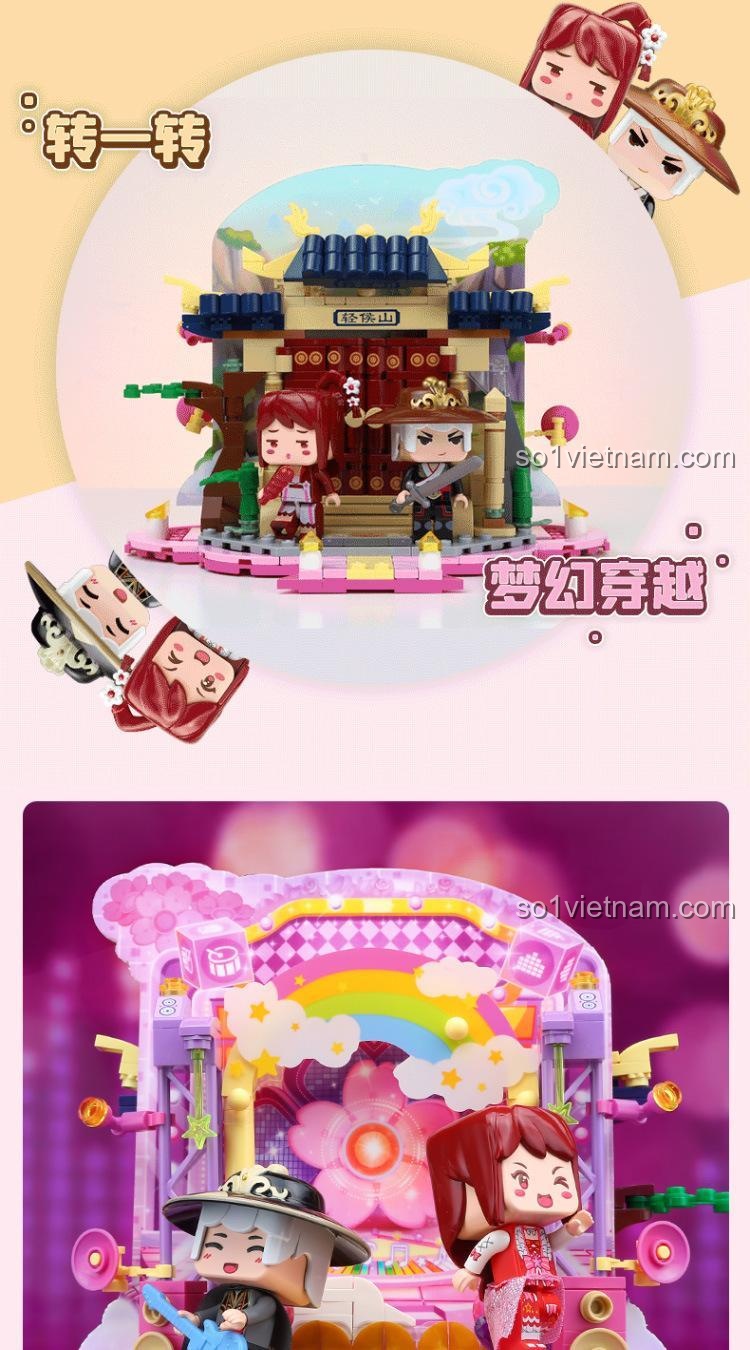 Sự kỳ diệu của đồ chơi mô hình Hoa Ngữ Trình Hành nằm ở thiết kế thông minh và đầy tính thẩm mỹ. Mô hình cao 15.5cm này là một tác phẩm nghệ thuật thực sự với hai mặt, hai thế giới hoàn toàn khác biệt. Một mặt là khung cảnh núi Khinh Hầu uy nghiêm, cổ kính với tông màu đỏ, xanh dương và vàng, gợi lên không khí của một câu chuyện kiếm hiệp lãng mạn. Chỉ cần một cú xoay nhẹ, thế giới hiện đại bỗng hiện ra với Sân khấu Ánh Sao rực rỡ sắc màu hồng, tím, lung linh dưới ánh đèn. Các chi tiết nhỏ như loa, đèn sân khấu, cầu vồng, và các phụ kiện cho 4 minifigures (2 nhân vật với 2 bộ trang phục khác nhau) đều được chăm chút tỉ mỉ, tạo nên một tổng thể hài hòa và sống động. Mỗi góc nhìn đều mang lại một cảm giác mới mẻ, kích thích thị giác và sự tò mò của bé, khiến bé không bao giờ cảm thấy nhàm chán.