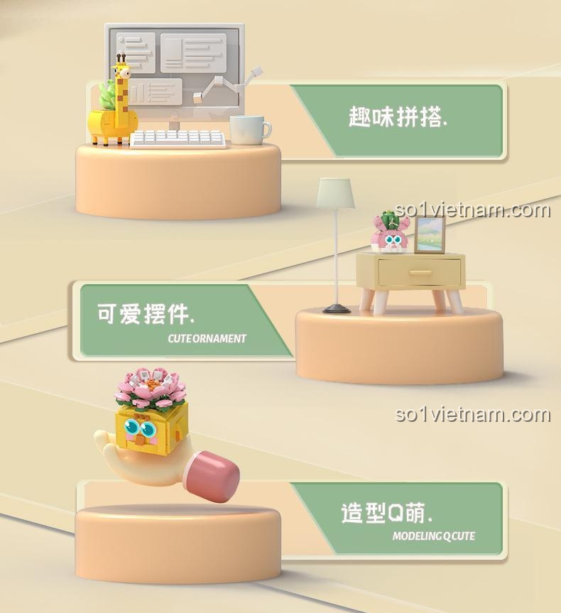• Kịch bản 3: Trang trí phòng. Sau khi lắp ráp xong, bé hãy tìm một vị trí thật đẹp trong phòng để đặt chậu cây thỏ xương rồng. Bé có thể thay đổi vị trí thường xuyên để tạo cảm giác mới mẻ cho không gian của mình.