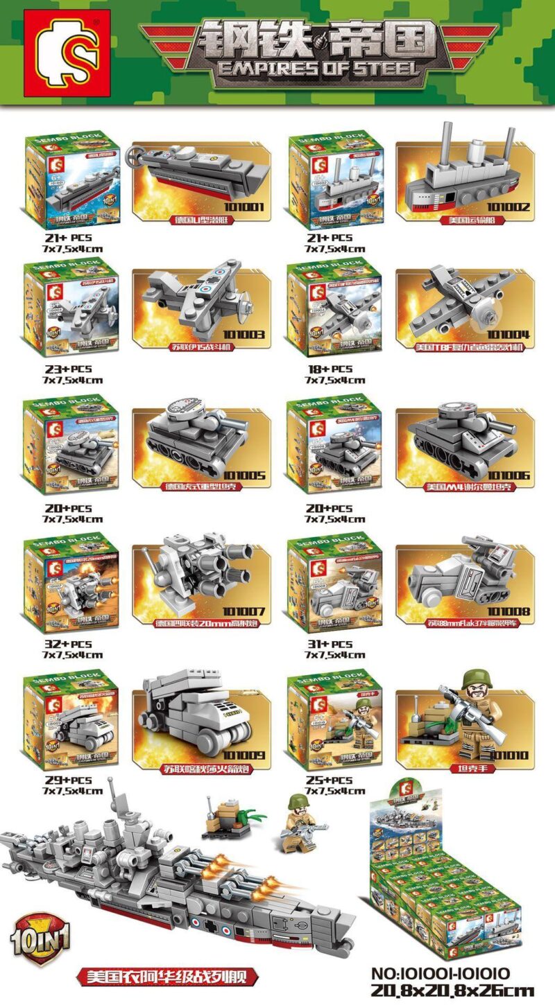 Bộ lắp ghép SEMBO 101001-101010 Thiết Giáp Hạm Iowa Hoa Kỳ 10 trong 1 là một minh chứng cho sự tinh xảo trong thiết kế. Với màu sắc chủ đạo là xám, mô hình tái hiện chân thực vẻ ngoài mạnh mẽ, uy nghi của các phương tiện quân sự. Mỗi trong số 10 mô hình nhỏ đều được chăm chút tỉ mỉ, từ đường nét của chiếc U-boat Đức, cánh quạt của máy bay TBF Avenger Mỹ, cho đến chi tiết của pháo Katyusha Liên Xô và lính tăng.