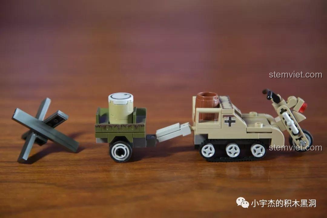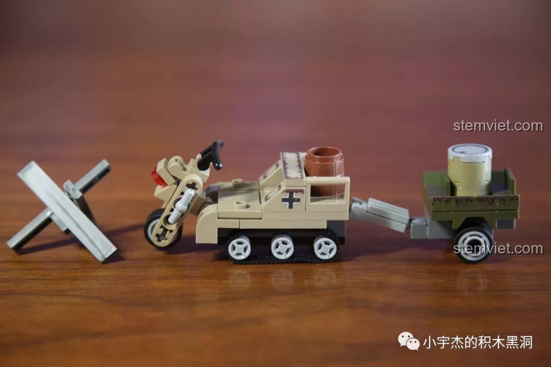 Ngay từ cái nhìn đầu tiên, bộ xếp hình 101107 đã gây ấn tượng mạnh với thiết kế nhỏ gọn nhưng đầy chi tiết. Tông màu nâu cát sa mạc chủ đạo, kết hợp với các chi tiết màu xám và đen, tái hiện chân thực vẻ ngoài của các phương tiện quân sự hoạt động trên chiến trường. Điểm nhấn đặc biệt nhất chính là cấu trúc ‘nửa xe máy, nửa xe tăng’ với bánh trước để điều hướng và hệ thống bánh xích phía sau để vượt địa hình. Mô hình còn đi kèm một rơ-moóc nhỏ để chở hàng và một chướng ngại vật chống tăng, mở ra vô số kịch bản chơi sáng tạo. Mỗi chi tiết, từ tay lái, yên xe cho đến thùng hàng trên rơ-moóc, đều được chăm chút tỉ mỉ, mang đến một mô hình hoàn chỉnh vừa đẹp mắt để trưng bày, vừa thú vị để vui chơi.