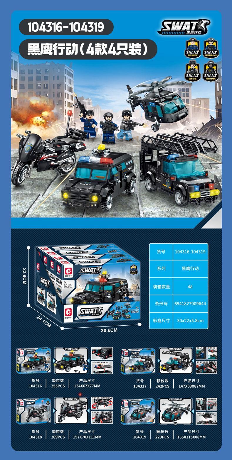 - Xe Tuần Tra Bọc Thép (Mã 104316 – 255 mảnh): Vững chãi và kiên cố, sẵn sàng phá vỡ mọi vòng vây, bảo vệ đồng đội tiến lên. Thiết kế hầm hố với màu đen và xanh đặc trưng của lực lượng SWAT.